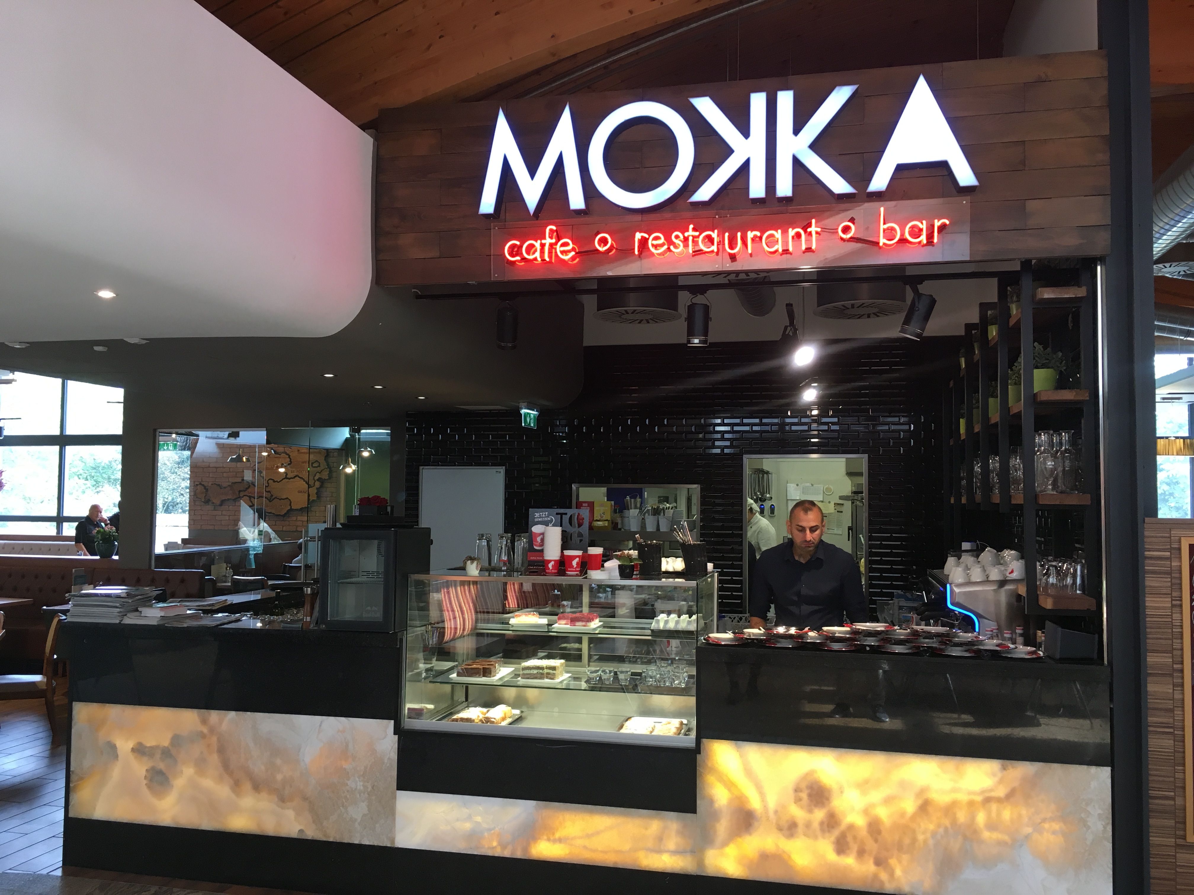 Útulná "Mokka" v nákupnom centre Traisenpark v St. Pöltene je kaviareň, reštaurácia a bar v jednom. Či už ide o jedálny lístok, vaflové menu alebo týždenné menu - na svoje si príde každý. To vám určite spríjemní prestávku na nákupy. Jedlo si môžete vziať aj so sebou.