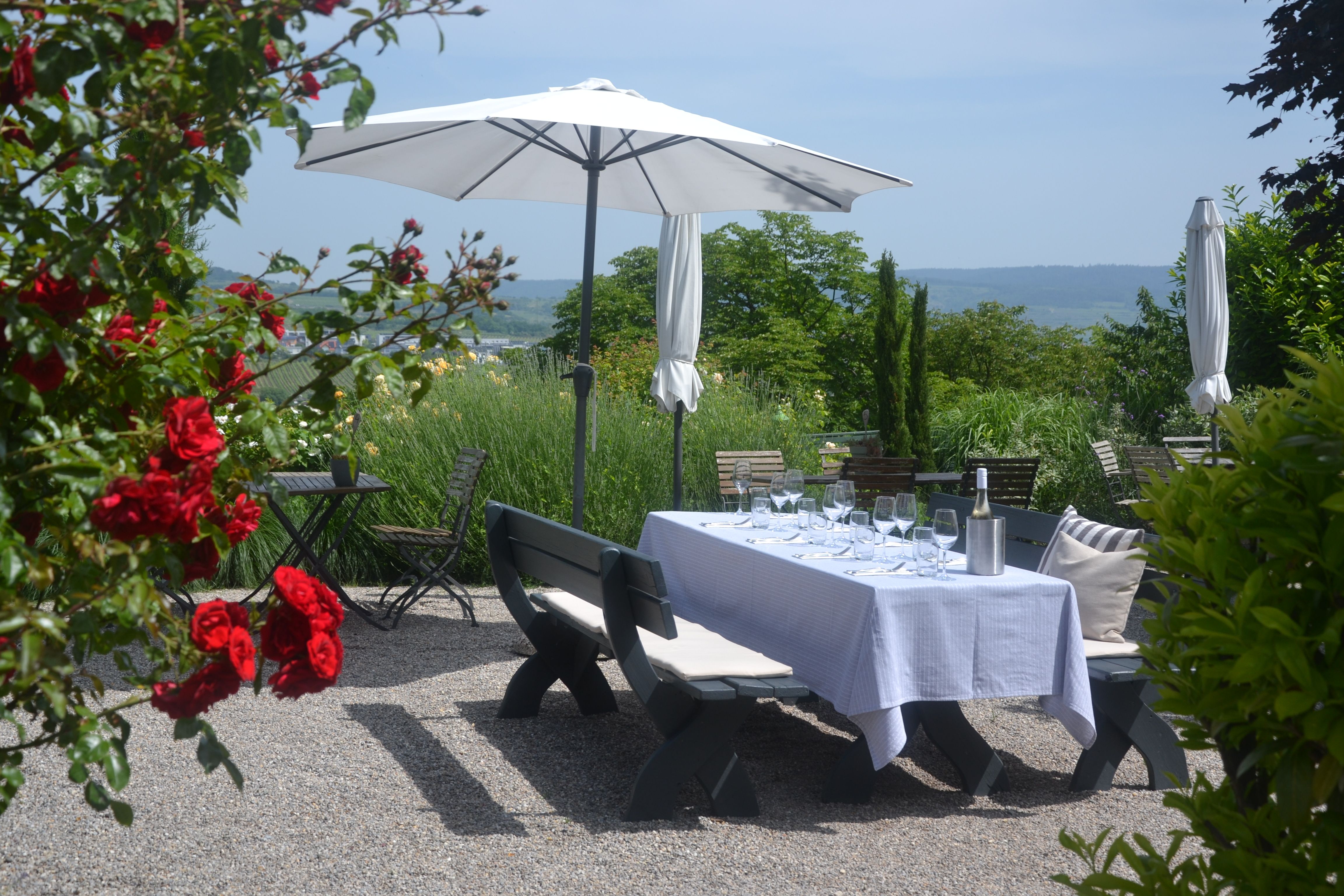 Za pekného počasia vás k posedeniu pozýva záhrada pre hostí s nádherným výhľadom na vinárske mestečko Langenlois.