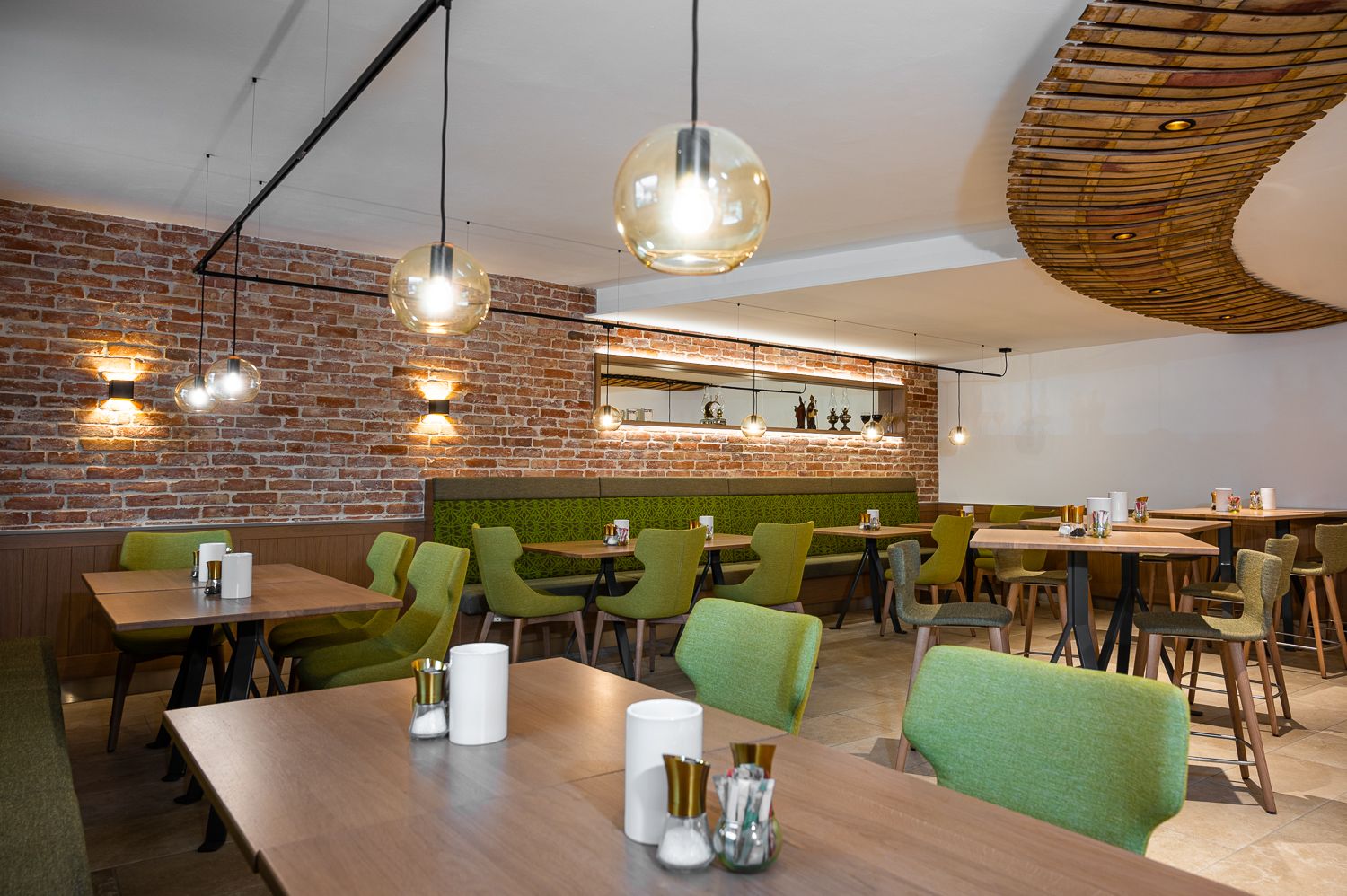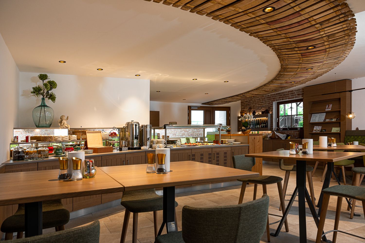 Pohľad do interiéru útulnej vinárne s drevenými stolmi a stojanmi na víno.