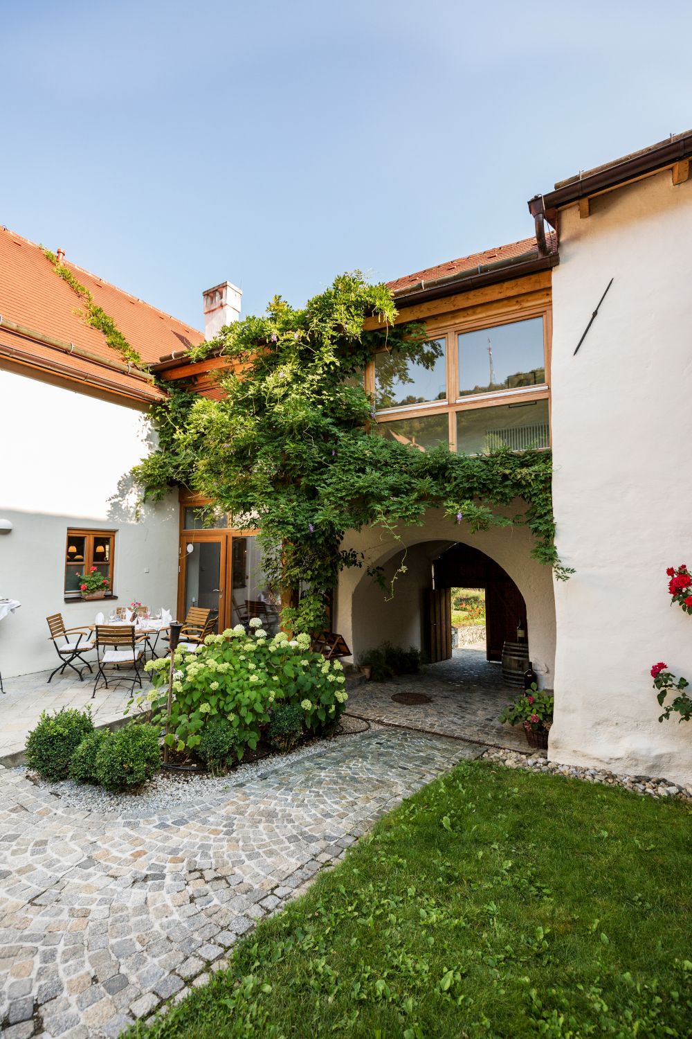 Umringt von Weingärten und historischen Mauern fühlt man sich in unserem Gutshof besonders wohl. Hier finden Gäste den passenden Rahmen für ein gediegenes Abendessen, unvergessliche Familienfeste, erfolgreiche Firmenfeiern, romantische Hochzeiten oder gemütliche Sonntagnachmittage. Die Räumlichkeiten bieten Platz für Gruppen bis zu 40 Personen. An schönen Tagen bietet sich der ruhige Gastgarten mit dem wunderbaren Blick zur Ruine zum Verweilen an.