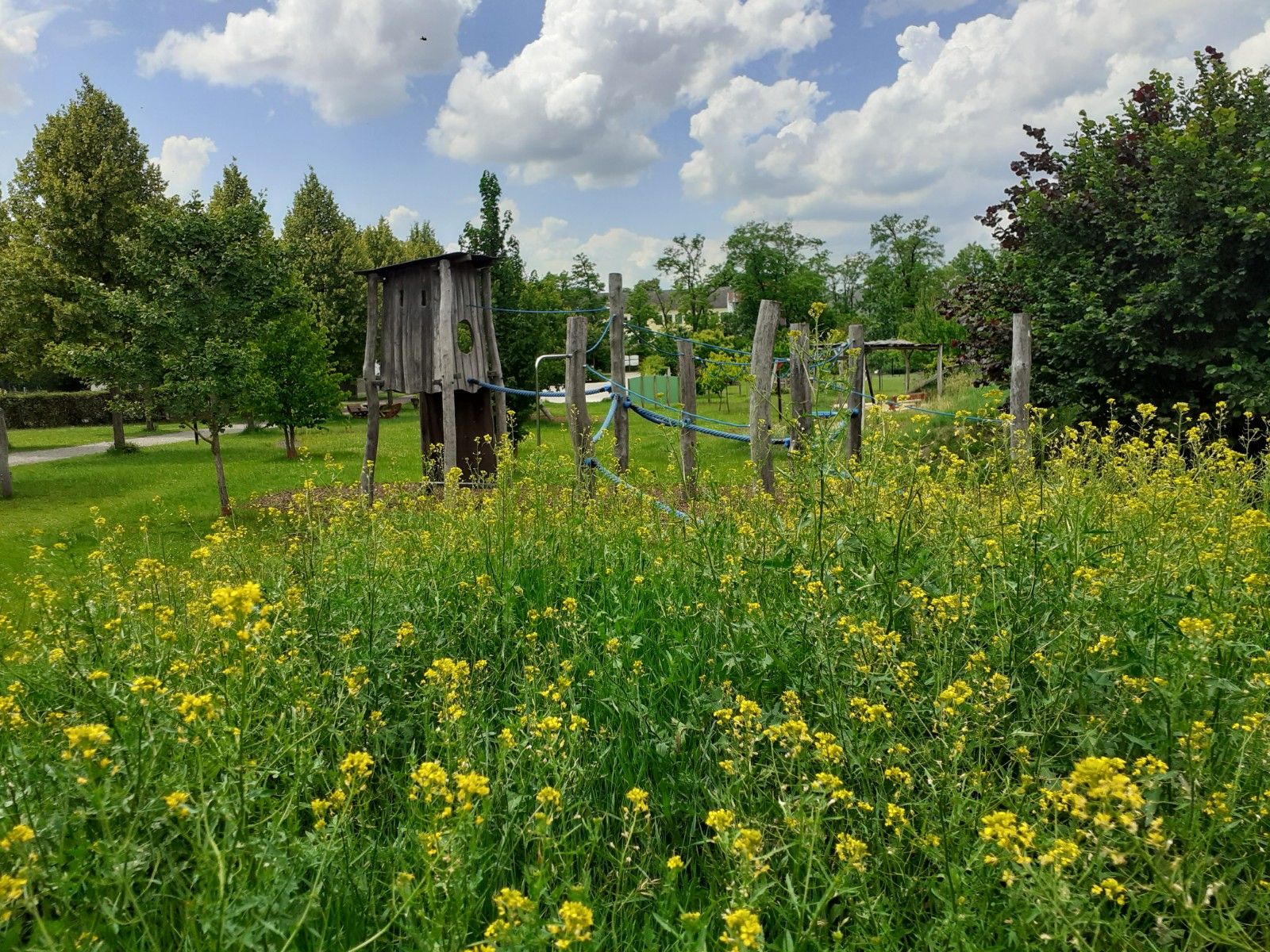 Priestranné detské ihrisko pre malé aj staršie deti. Lietajúca líška, šmykľavka, vodné hry, hojdačky, lanové zábradlie, kopec a veľká zelená plocha. Na detskom ihrisku nie je čo riešiť. Uprostred aleje stromov sú k dispozícii lavičky a stoly na krátku prestávku a občerstvenie.