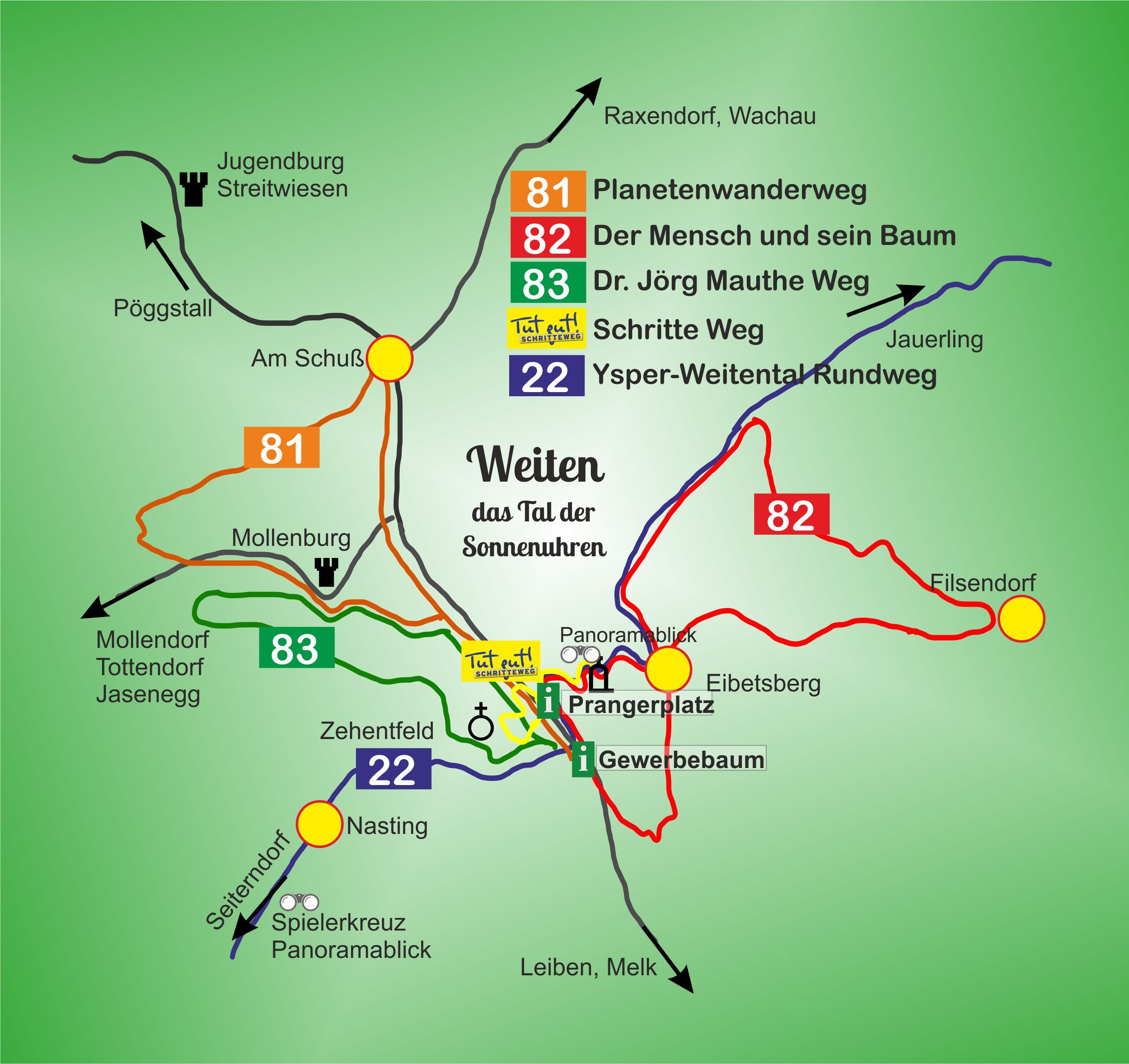 Dovolenka v údolí slnečných hodín: V trhovom mestečku Weiten v okrese Melk víta hostí čerstvý vzduch, bohato zalesnené svahy a udržiavaná lúčna krajina. Mesto s dobrým pocitom leží medzi horskými masívmi Jauerling (959 m) a Ostrong (1060 m) v južnej časti Waldviertelu, v jednom z najkrajších údolí Dolného Rakúska: Ysper-Weitental, známom aj ako "Údolie slnečných hodín". Idylické výletné ciele a nádherné turistické trasy robia z pobytu vo Weitene nezabudnuteľný rodinný zážitok.