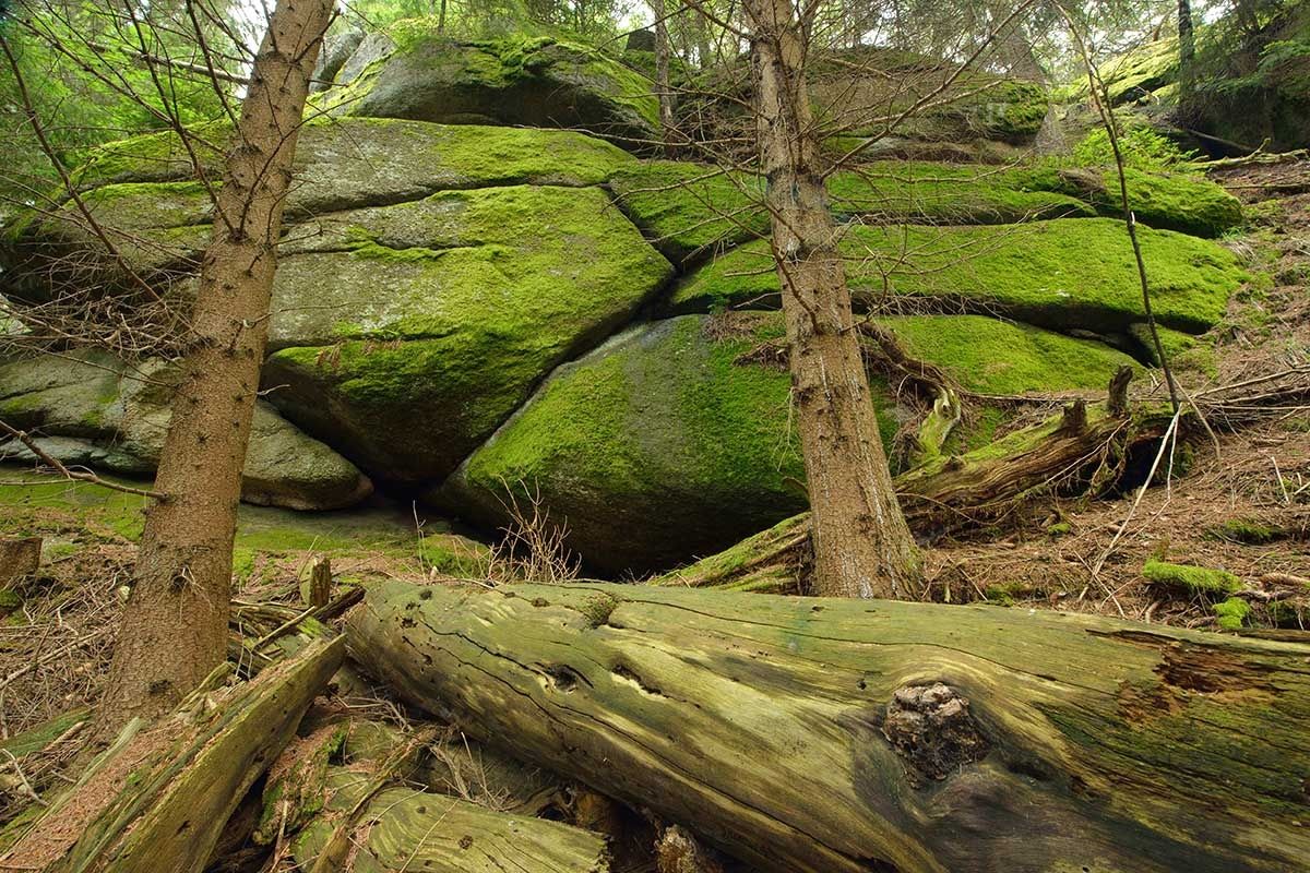"Fichtenschluff", "Pilzstein", "Steinerner Torbogen", "Wuchtelstein", "Gletschermühle" sú názvy bizarných skalných útvarov, ktoré sa naozaj oplatí vidieť. "Kamenný oblúk" je mimoriadne vzácny geologický úkaz, pretože oblúky sa zvyčajne nachádzajú vo vápencových horách. Žulový oblúk sa tiahne medzi dvoma veľkými balvanmi. Môžete sa prejsť po jeho spodnej časti aj po jeho vrchole. Z oblúka sa môžete pozrieť dole na "Wuchtelstein", ktorý vyzerá presne tak, ako jeho názov. "Gletschermühle" je približne 12 metrov vysoká žulová veža so zvláštnymi, dutými priehlbinami pripomínajúcimi ľadovcový mlyn. Skalný útvar však nemá nič spoločné s dobou ľadovou: Bizarné žulové tvary vznikli zvetrávaním vyše 350 miliónov rokov starého primárneho skalného masívu. ("Skutočné" ľadovcové mlyny sú špirálovité priehlbiny v ľade, ktoré vznikli topením vody).