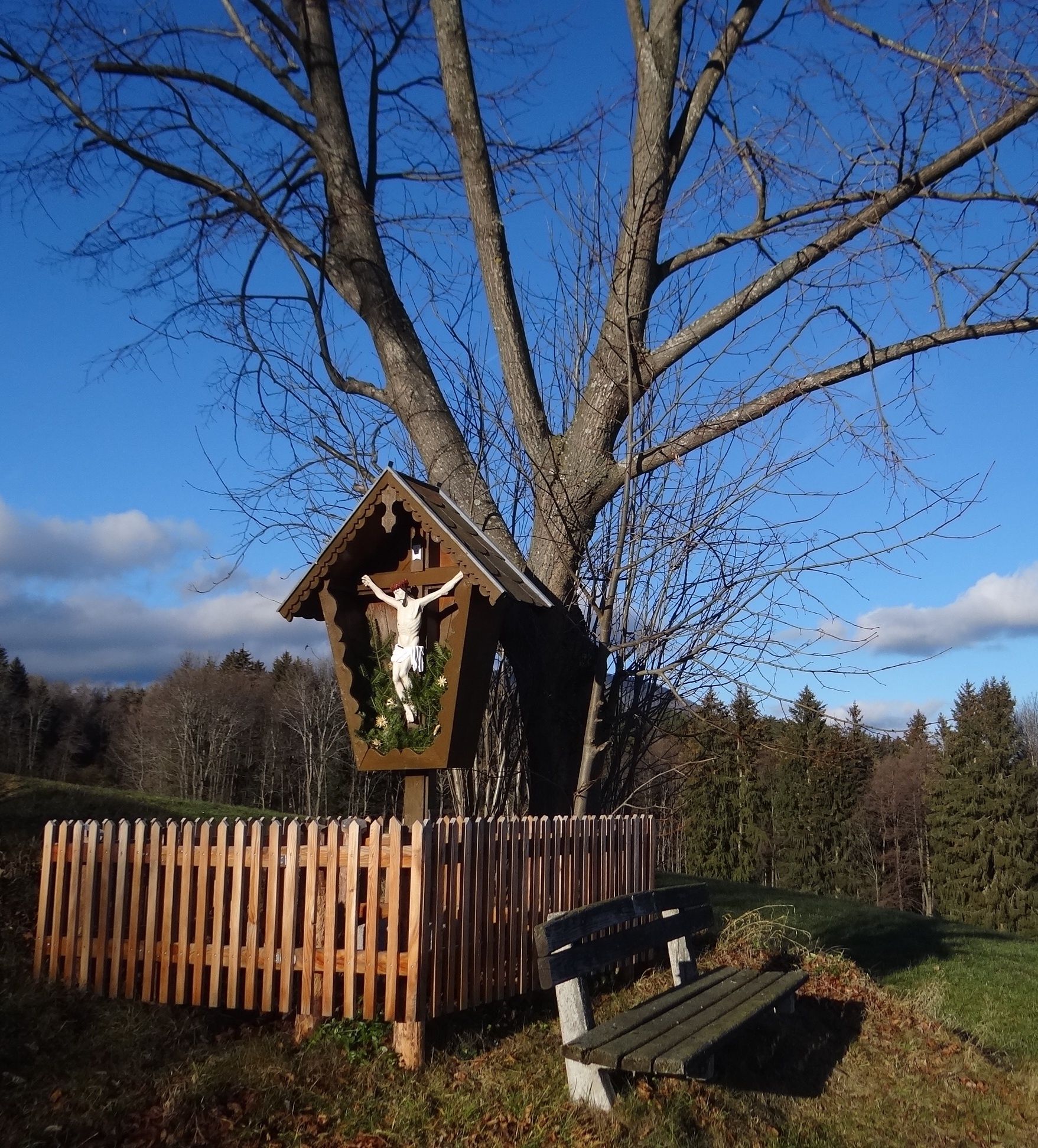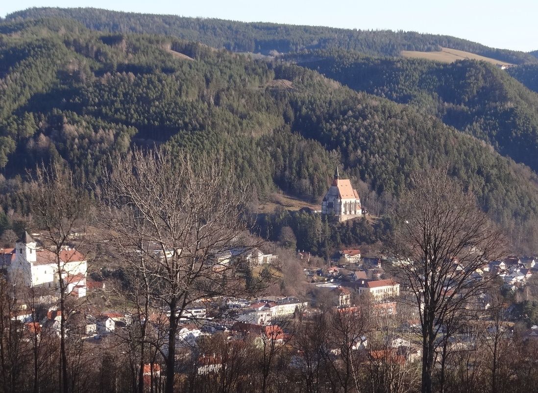 Po tejto ceste ideme až do ďalšej ostrej zákruty vpravo, za ktorou nás žltá značka nasmeruje doľava, kde ideme pomerne strmo do kopca po okraji poľa. Nakoniec sa dostaneme k prícestnej kaplnke s lavičkou, kde si môžeme dopriať prvý zaslúžený odpočinok a vychutnať si výhľad na Kirchberg a jeho dva kostoly. Teraz ideme chvíľu po asfaltovej ceste, až kým nedôjdeme ku "Kreuzbauern", po ktorej vstúpime do lesa na lesnú cestu. Čoskoro sa dostaneme na rázcestie. Tá naľavo vedie na Steyersberger Schwaig, tá úplne napravo späť dolu do údolia. Vyberieme si stredovú cestu so žltým značením. Po tejto lesnej ceste, ktorá už vyrástla, potom putujeme pomerne dlho. Nakoniec vyjdeme z lesa a prejdeme cez prírodnú priehradu, takzvanú "Holzgasse", ktorá je už v údolí Alpltal. Aj tu vás na oddych pozýva lavička. Aj tu máte pred sebou vydru a krásny výhľad na Rax.