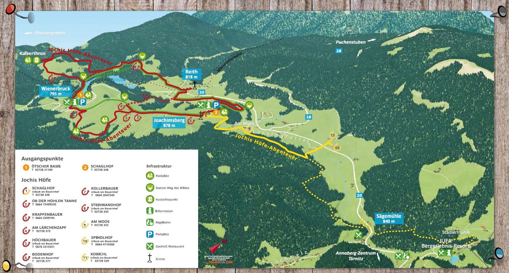 Jochi vás vezme na krásnu a nenáročnú túru na jedenásť fariem v oblasti medzi Wienerbruckom a Annabergom. Čakajú na nich hádanky, ktoré treba vyriešiť. Zároveň sa návštevníci môžu dozvedieť viac o zvieratách a živote na farme. Čo robia na farme haflingské kone, kravy, ošípané a sliepky? Ako farmári tradične pracujú na poliach a v lesoch?