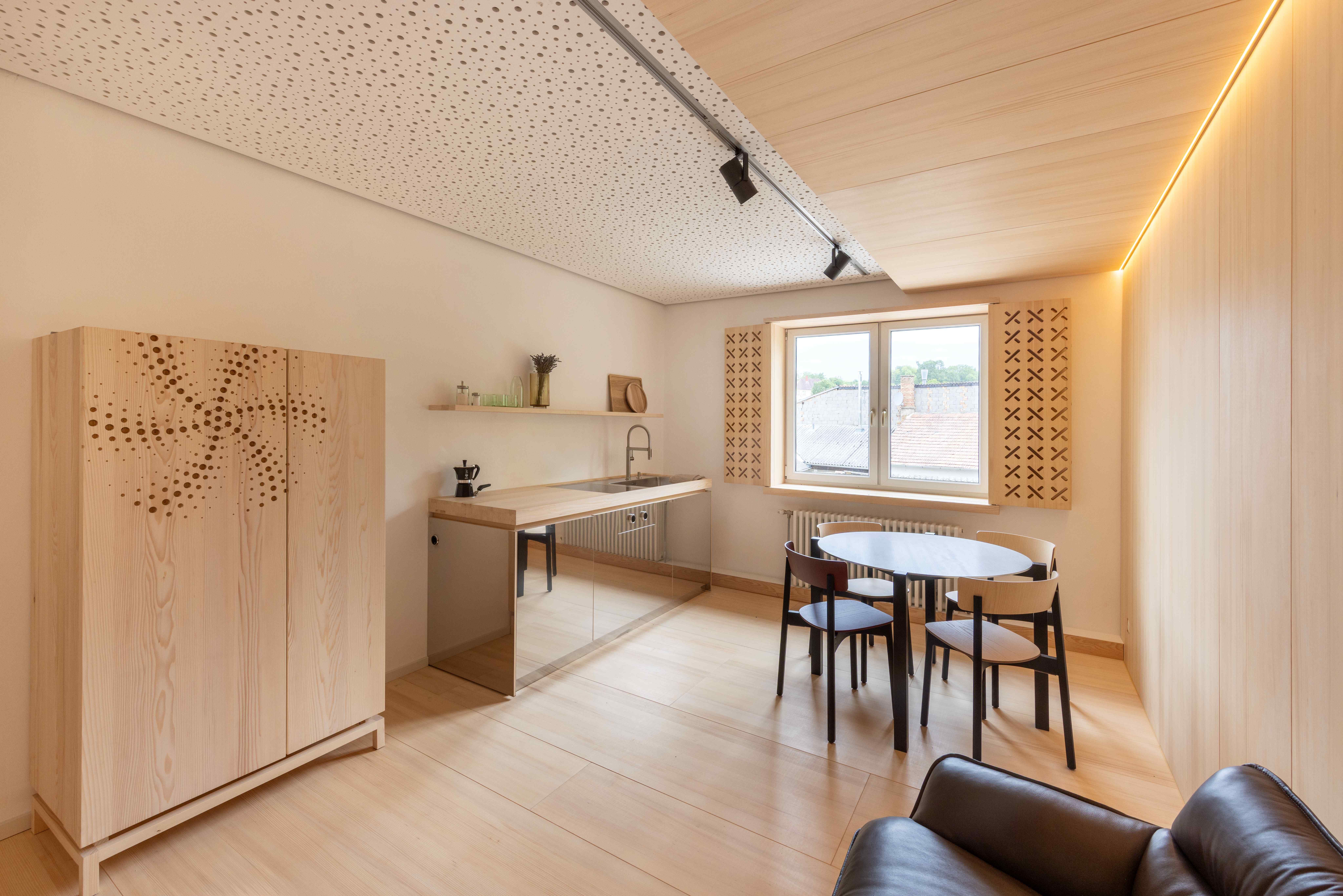 Nábytok pochádza z vlastnej stolárskej dielne hotela a spája funkčnosť s estetikou. Srdcom domu je plne vybavená kuchyňa s kvalitnými spotrebičmi značky Bora, skrinou na riad a kávovarom. Útulný priestor na sedenie a pohovka s funkciou spania vás pozývajú na dlhé posedenie. Ponuku dopĺňa samostatná spálňa s pohodlnou manželskou posteľou a kúpeľňa so sprchovacím kútom a samostatným WC. K dispozícii sú uteráky, posteľná bielizeň a sušič vlasov.