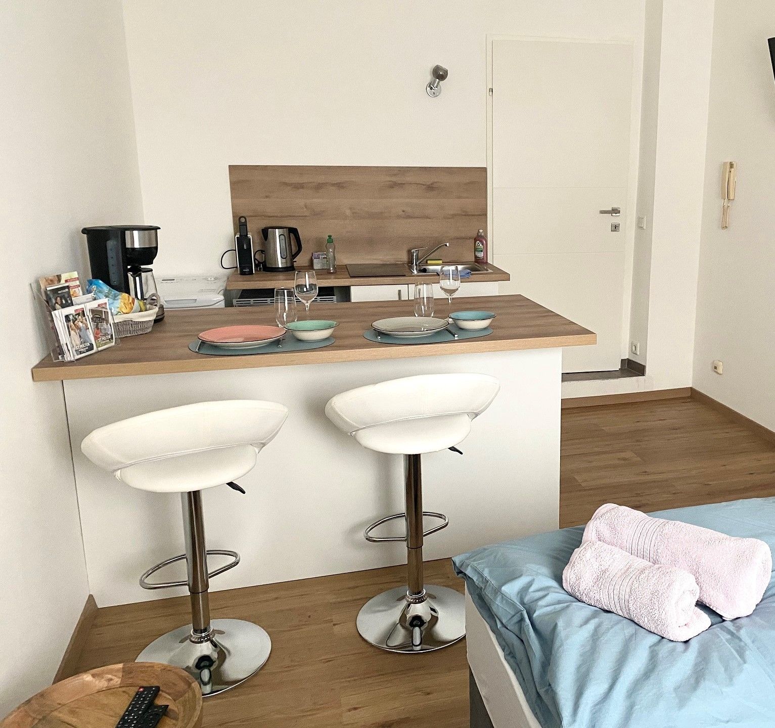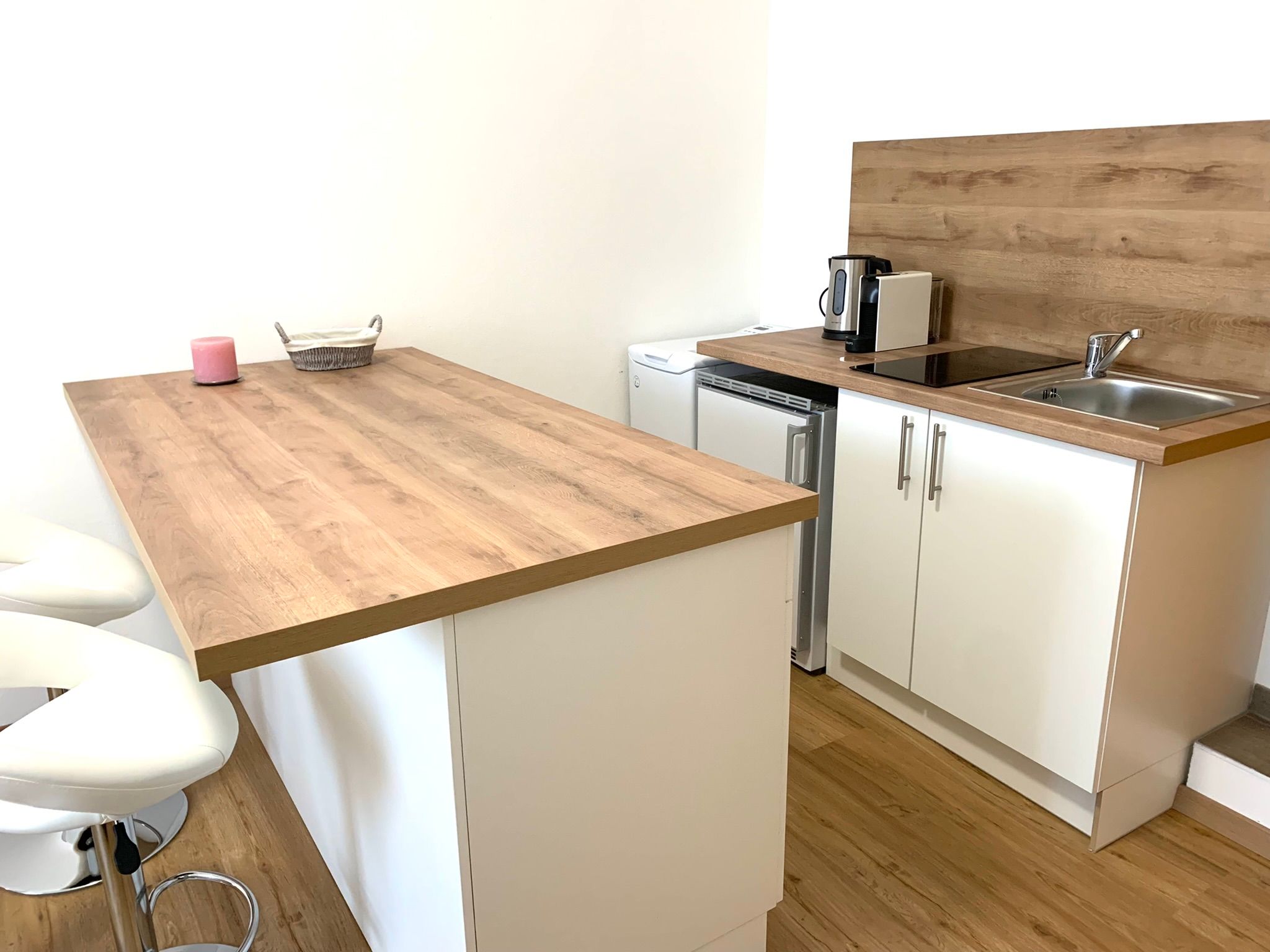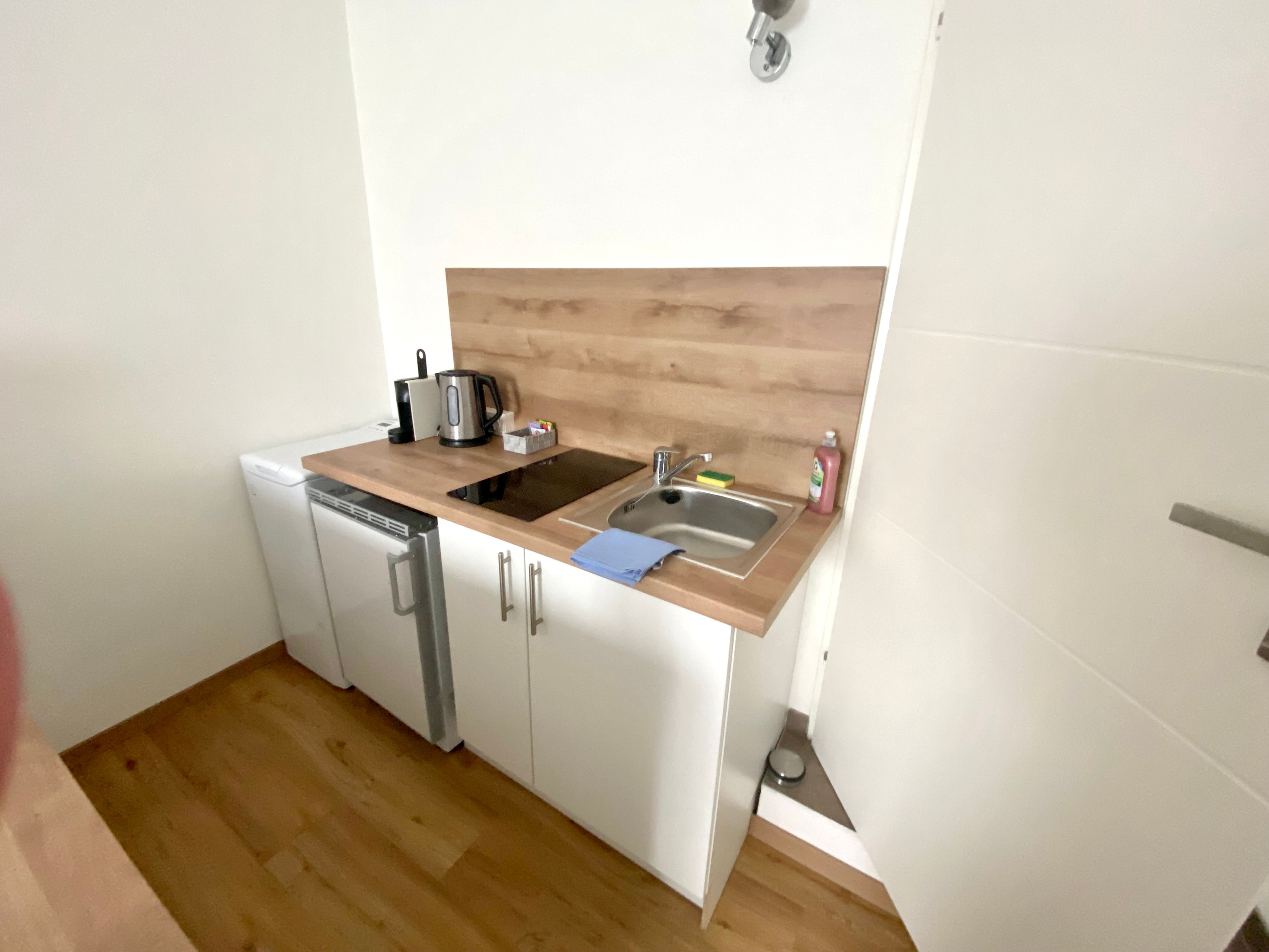 Kuchyňa s chladničkou, kávovarom na espresso, kávovarom, rýchlovarnou kanvicou