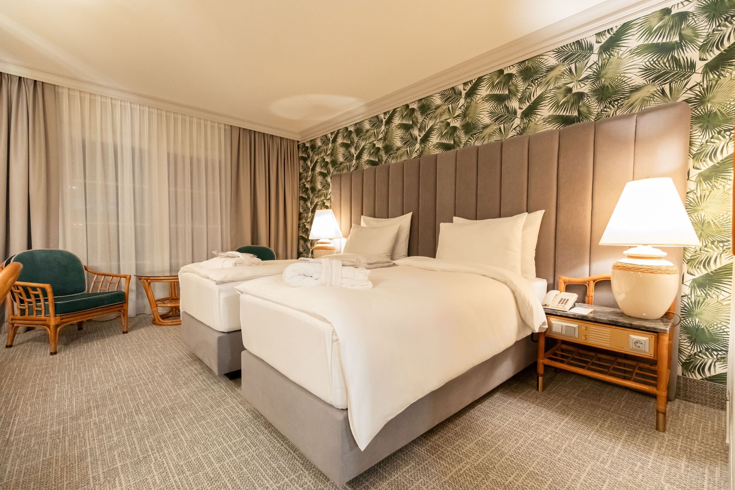 Vo vnútri ponúka priestor pre 461 komfortných 4-hviezdičkových izieb a apartmánov, moderné kongresové centrums rozlohou 3 500 m² , množstvo reštauráciía barov, ako aj priestranné wellness a kúpalisko.