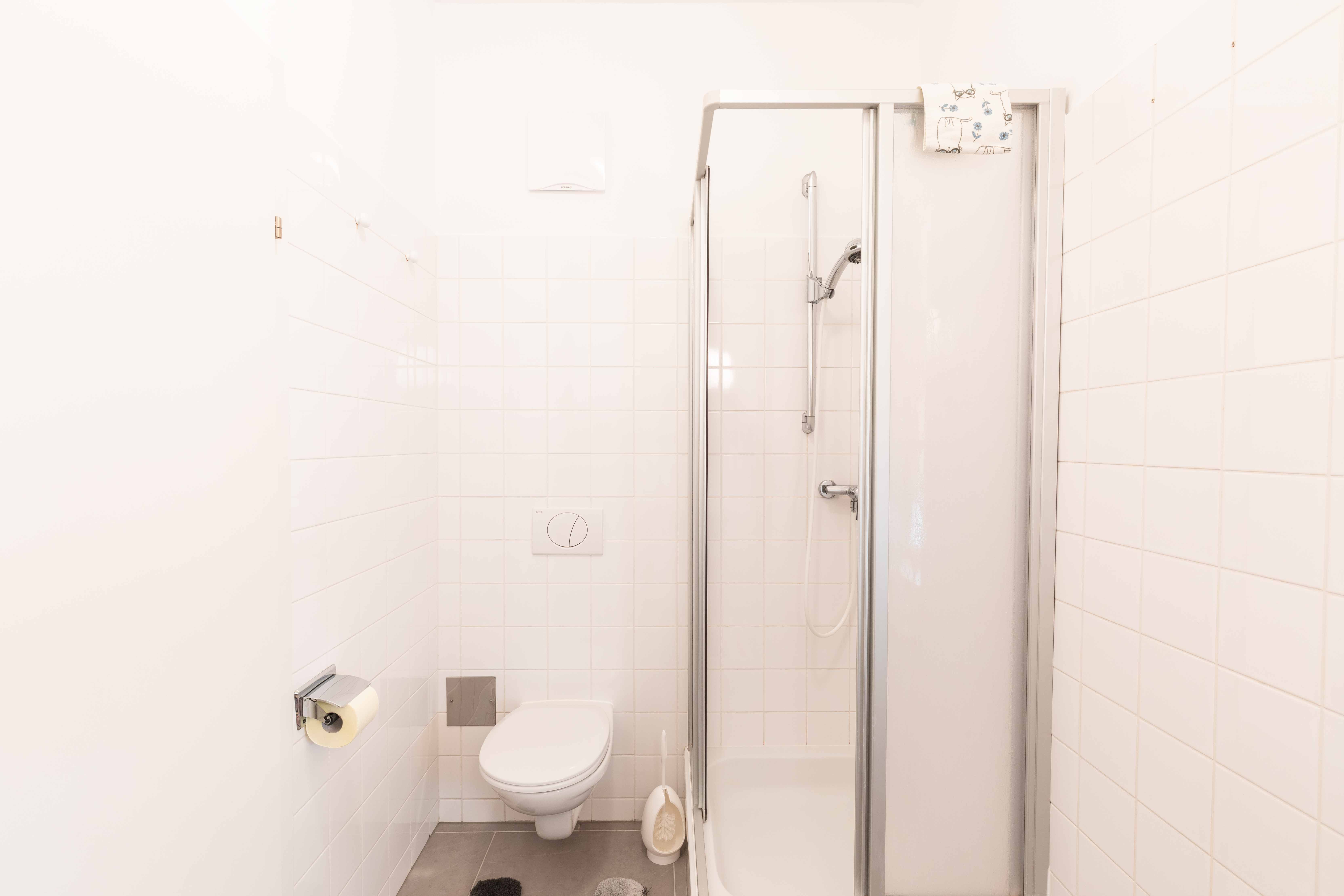 Kúpeľňa so sprchovacím kútom (uteráky), práčka, sušič vlasov