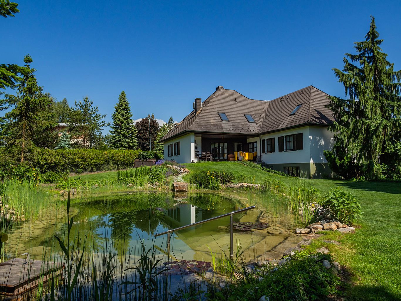 Náš dom sa nachádza na pokojnom mieste, záhrada pripomínajúca park s jazierkom na kúpanie a trávnikom na opaľovanie s lehátkami na voľné použitie je ideálna pre seniorov a športovo založených hostí.