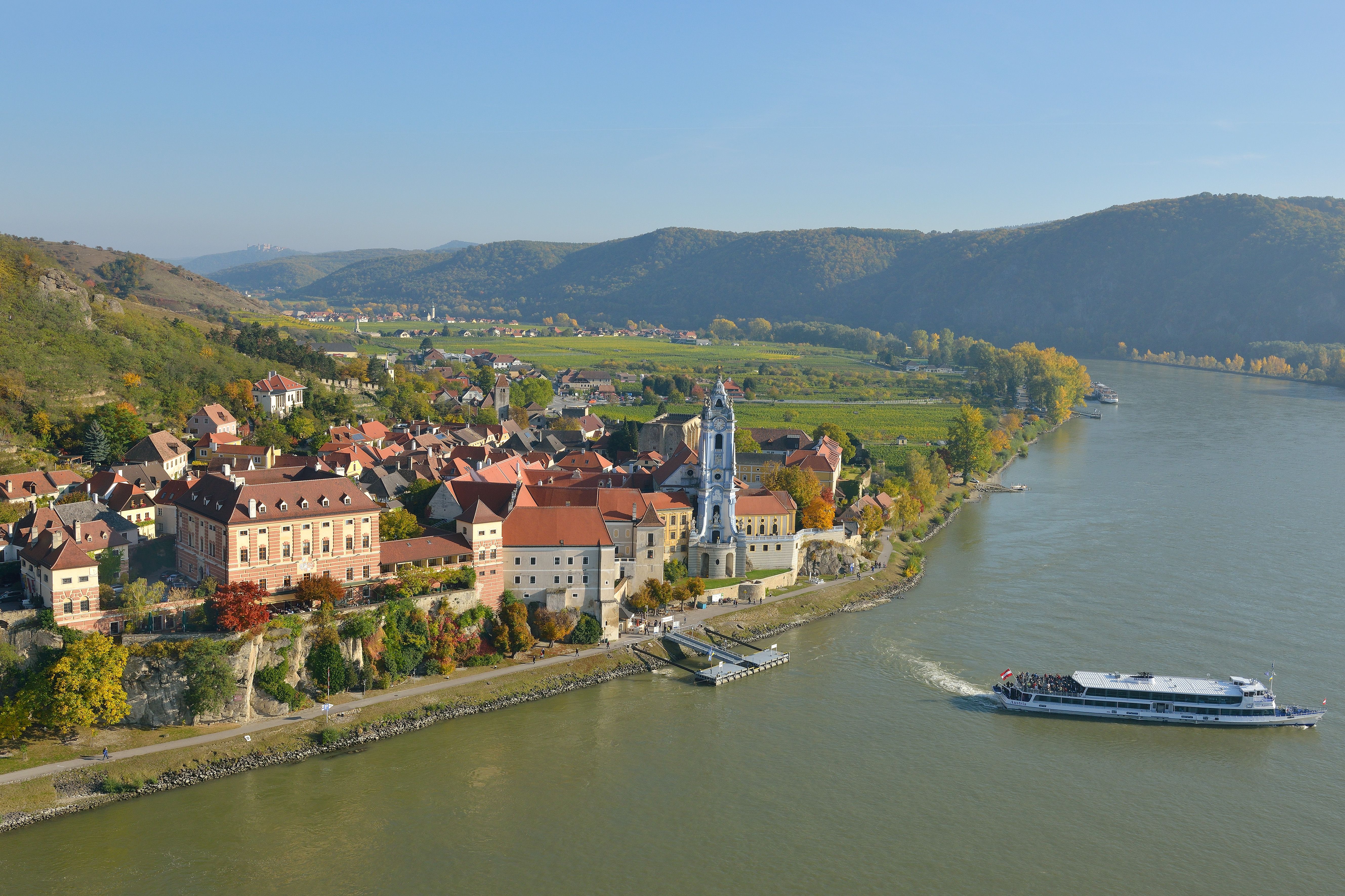 Zavedú vás do jednej z izieb, z ktorých každá sama osebe je jedinečným svetom. Niektoré majú klenbové stropy, iné jemné ušľachtilé parketové podlahy a sú zariadené starožitným nábytkom. Za oknom preteká Dunaj a vinice sa ako zelené more tiahnu až k obzoru. Masáže, vonkajší a krytý bazén, ako aj sauna a infračervená kabína vás pozývajú stráviť príjemné chvíle pohody a relaxu. Či už ste hosťami nášho hotela, alebo ste sa u nás zastavili len na pár hodín: Reštaurácia na zámku Dürnstein ponúka jedlá rakúskej aj medzinárodnej kuchyne na najvyššej úrovni. V závislosti od počasia sa jedlo podáva na terase pri Dunaji so zimnou záhradou alebo v štýlových vnútorných priestoroch zámku.