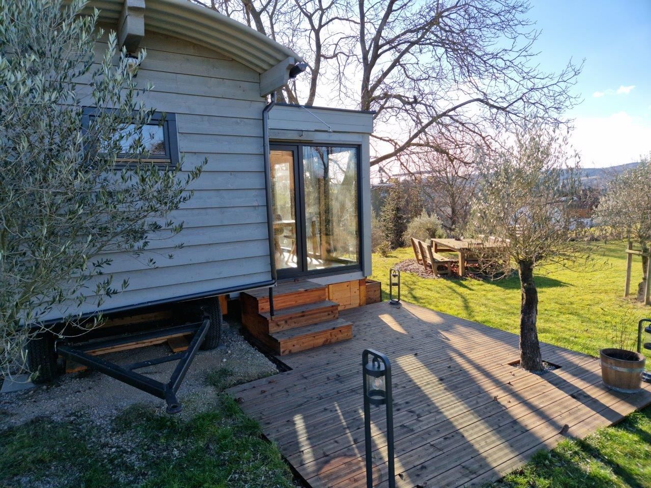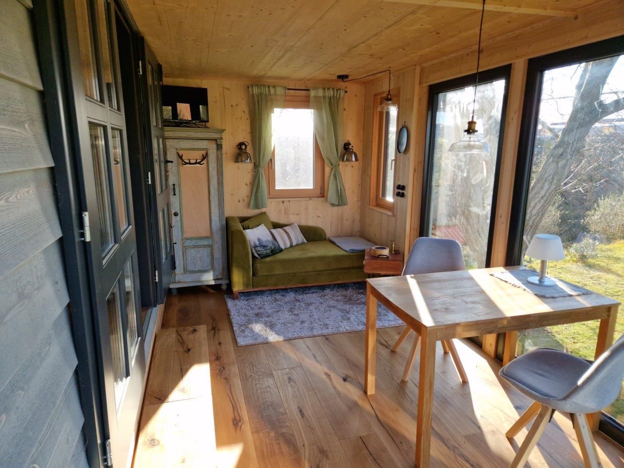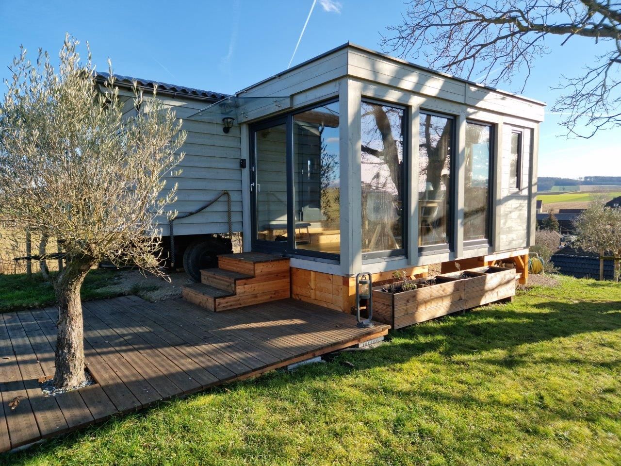 Tiny House "Luise" - upravený cirkusový vagón - ponúka moderné, prírode blízke bývanie na veľkej lúke s nádherným panoramatickým výhľadom a vlastným fotovoltaickým systémom, takže si môžete užívať do značnej miery energeticky nezávislú dovolenku.