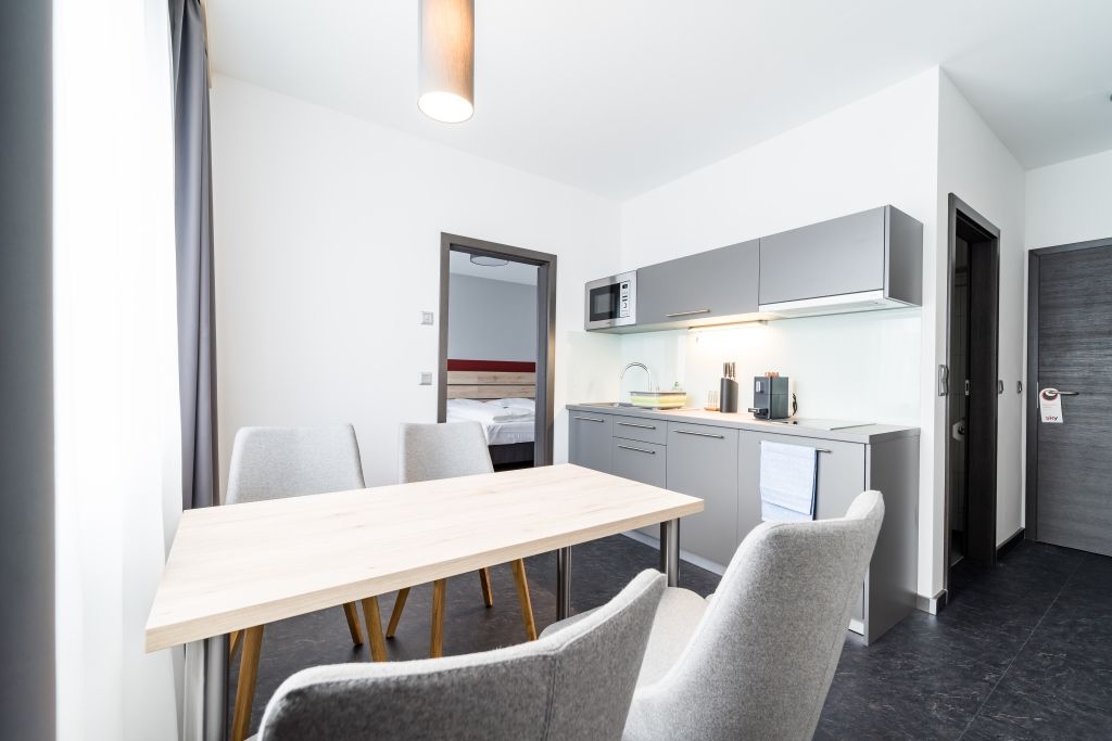 Čakajú na vás moderné jednolôžkové izby, dvojlôžkové izby alebo štúdiá s malou kuchynkou.