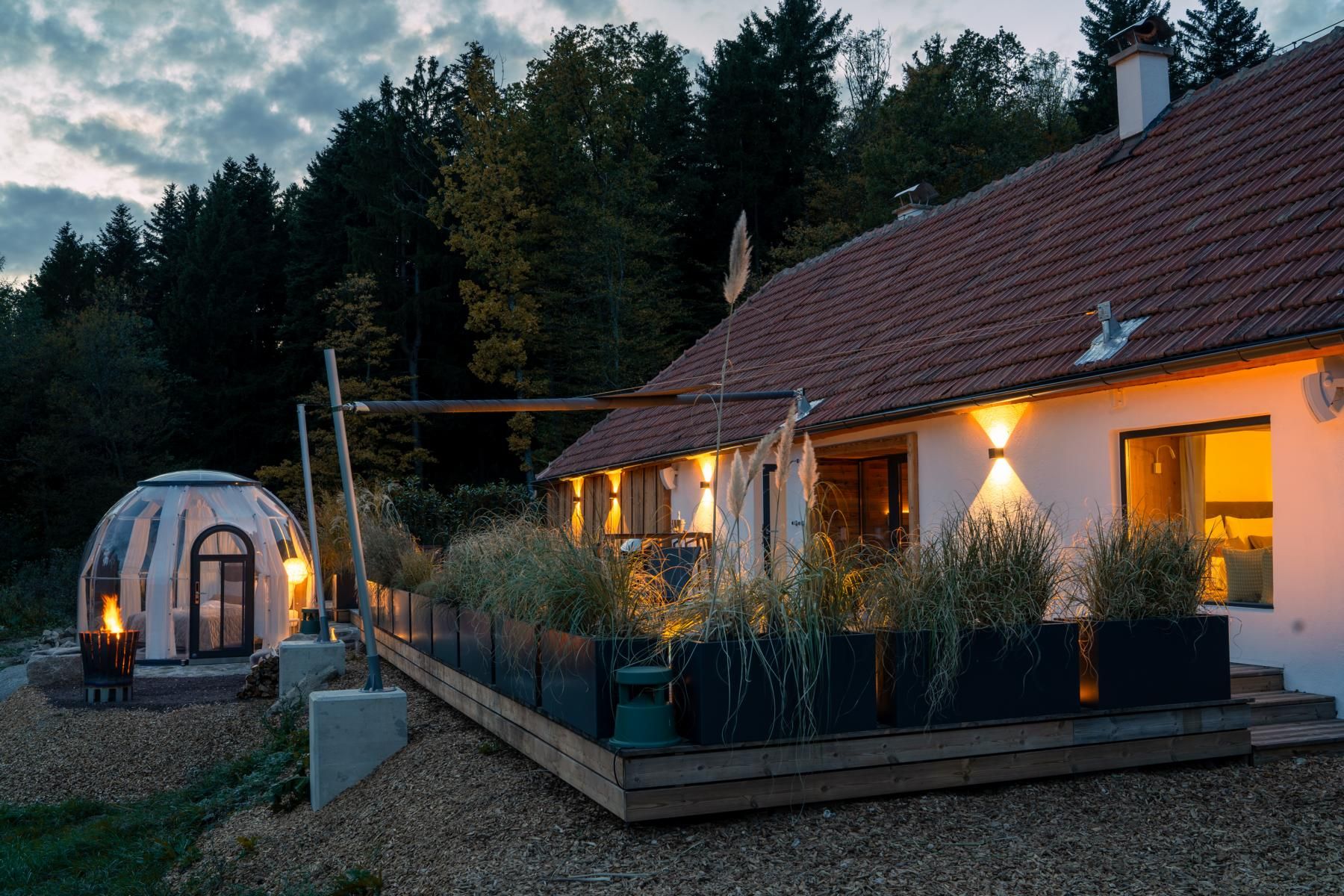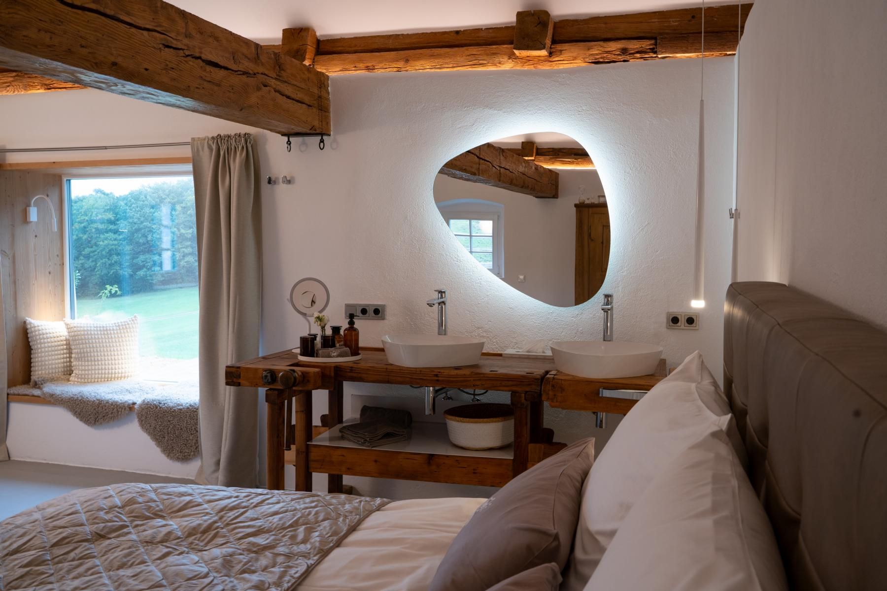 Zažite čistý luxus v našej chate, ktorá sa nachádza na absolútne odľahlom mieste obklopenom pastvinami a lesmi. Tu si môžete vychutnať nerušený pokoj, obdivovať hviezdnu oblohu a dokonca spať pod trblietajúcimi sa hviezdami v "hviezdnej posteli", manželskej posteli od spoločnosti CASARISTA. Toto útočisko je ideálne pre páry na svadobnej ceste a všetkých, ktorí hľadajú jedinečnú a súkromnú oázu pohody s vlastnou saunou,vírivkou (totožnou, ale vždy s čerstvou vodou) a voľne stojacou vaňou.