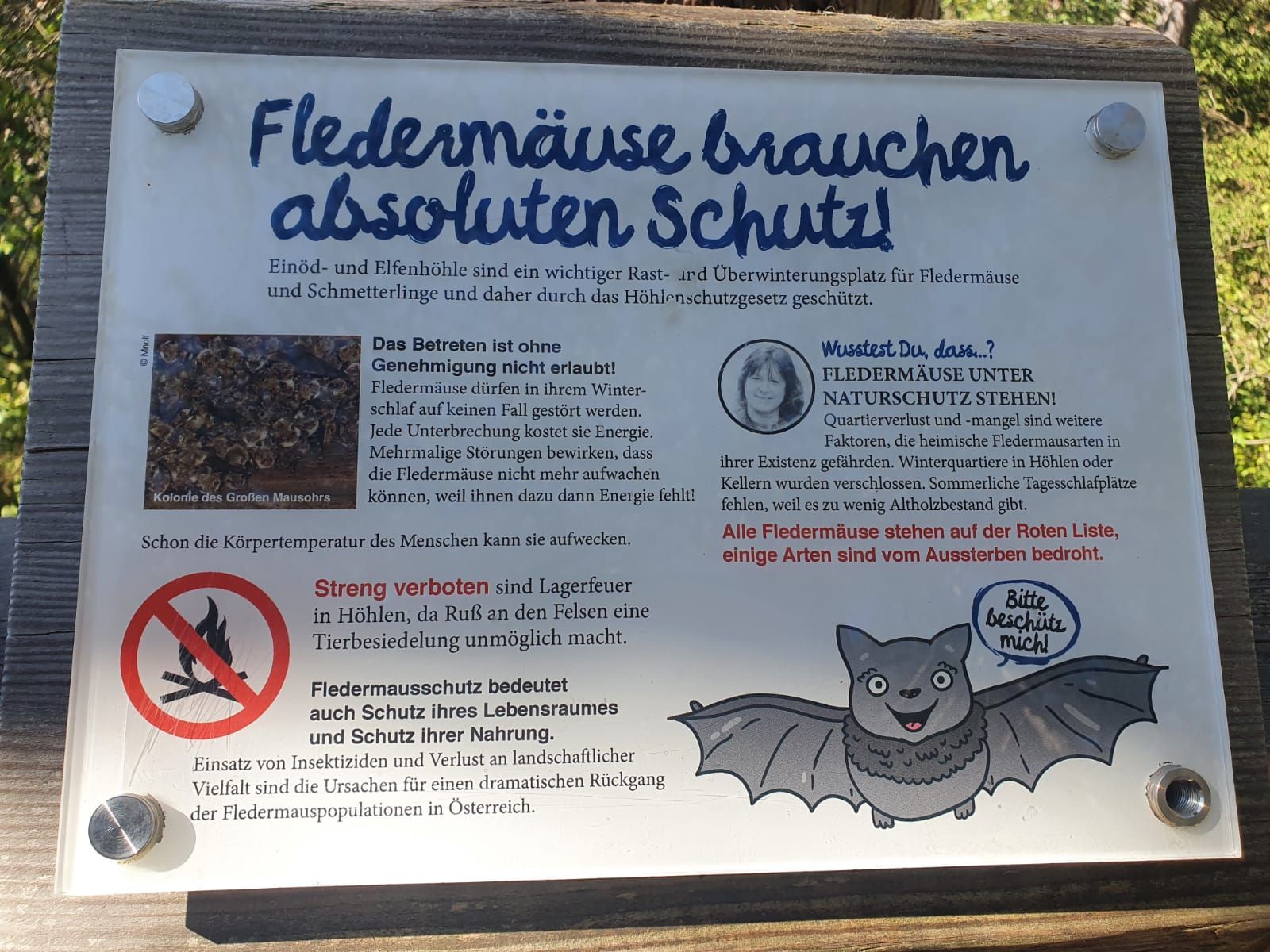 Po niekoľkých stovkách metrov sa dostaneme na nový "Dobrodružný chodník pre netopiere", náučný chodník s pôsobivými hracími a náučnými stanovišťami, ktorý nás zoznámi s netopiermi a zavedie nás k jaskyniam "Einödhöhlen", ktoré sú domovom týchto jaskynných obyvateľov, ktorí si zaslúžia mimoriadnu ochranu. Einödhöhle je najväčšia zachovaná mladotreťohorná príbojová jaskyňa na západnom okraji Viedenskej panvy a v roku 1949 bola vyhlásená za prírodnú pamiatku. V rámci tohto projektu sa upravujú vchody do jaskyne a jej okolie. V blízkosti "Einödhölen" sa staré lesné ihrisko premení na "netopieriu lúku" a vybaví sa vhodným hracím zariadením. Ak máte chuť, môžete sa vybrať na chatu/chaty Rudolfa Prokscha (541 m n. m.) a vychutnať si nádherný výhľad z historickej vyhliadkovej plošiny ("Klesheimwarte").