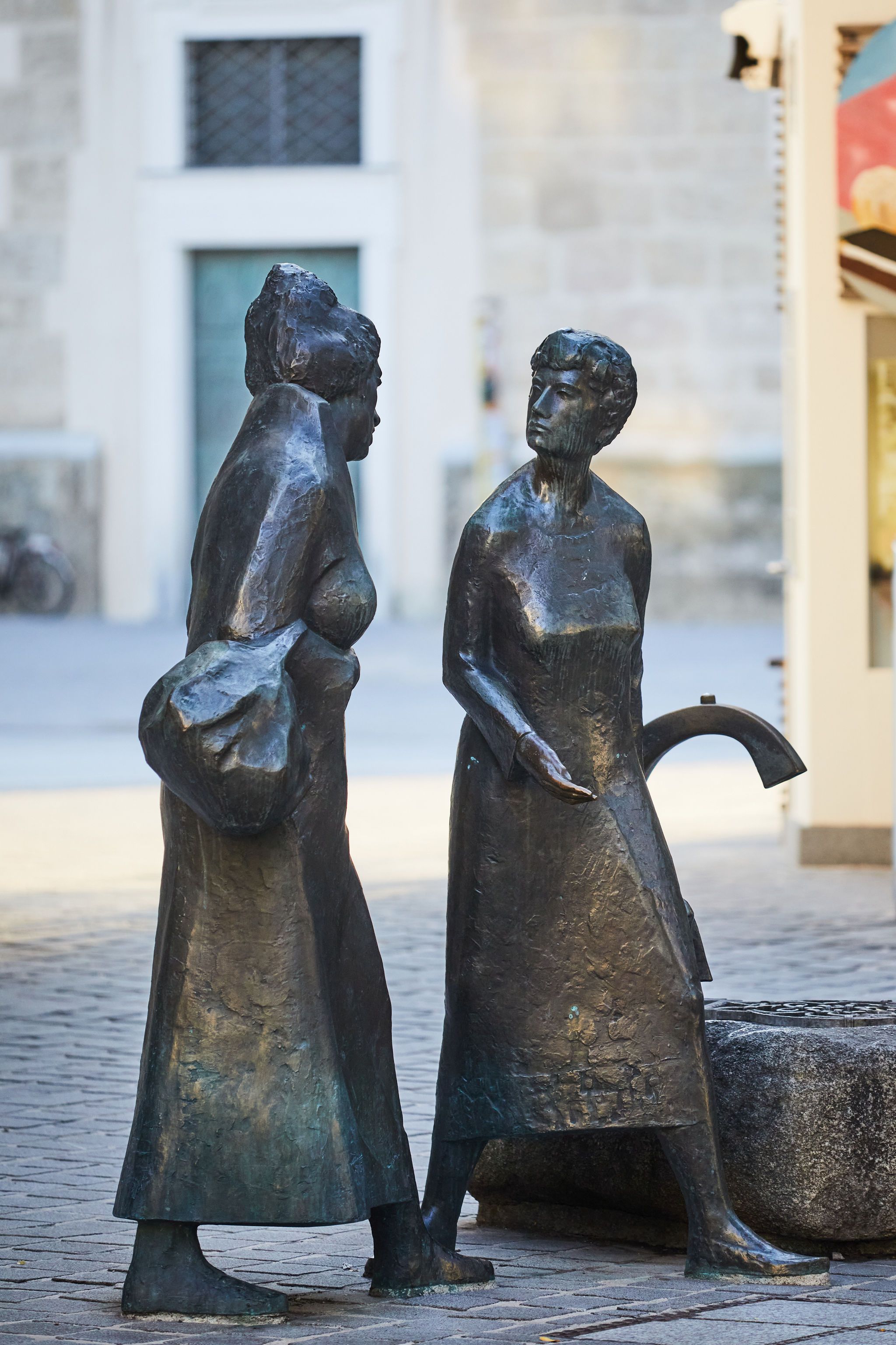 Oproti, v severnom rohu námestia, stojí moderný náprotivok barokového sveta symbolov: socha "Klebetiace ženy" od Hansa Freilingera, vytvorená v roku 1990, je obľúbeným motívom na fotografie - najmä medzi turistami. Humorný výjav sa prekvapivo dobre snúbi s historickou atmosférou a zdôrazňuje, že Herrenplatz nie je len miestom minulosti, ale aj živej prítomnosti.