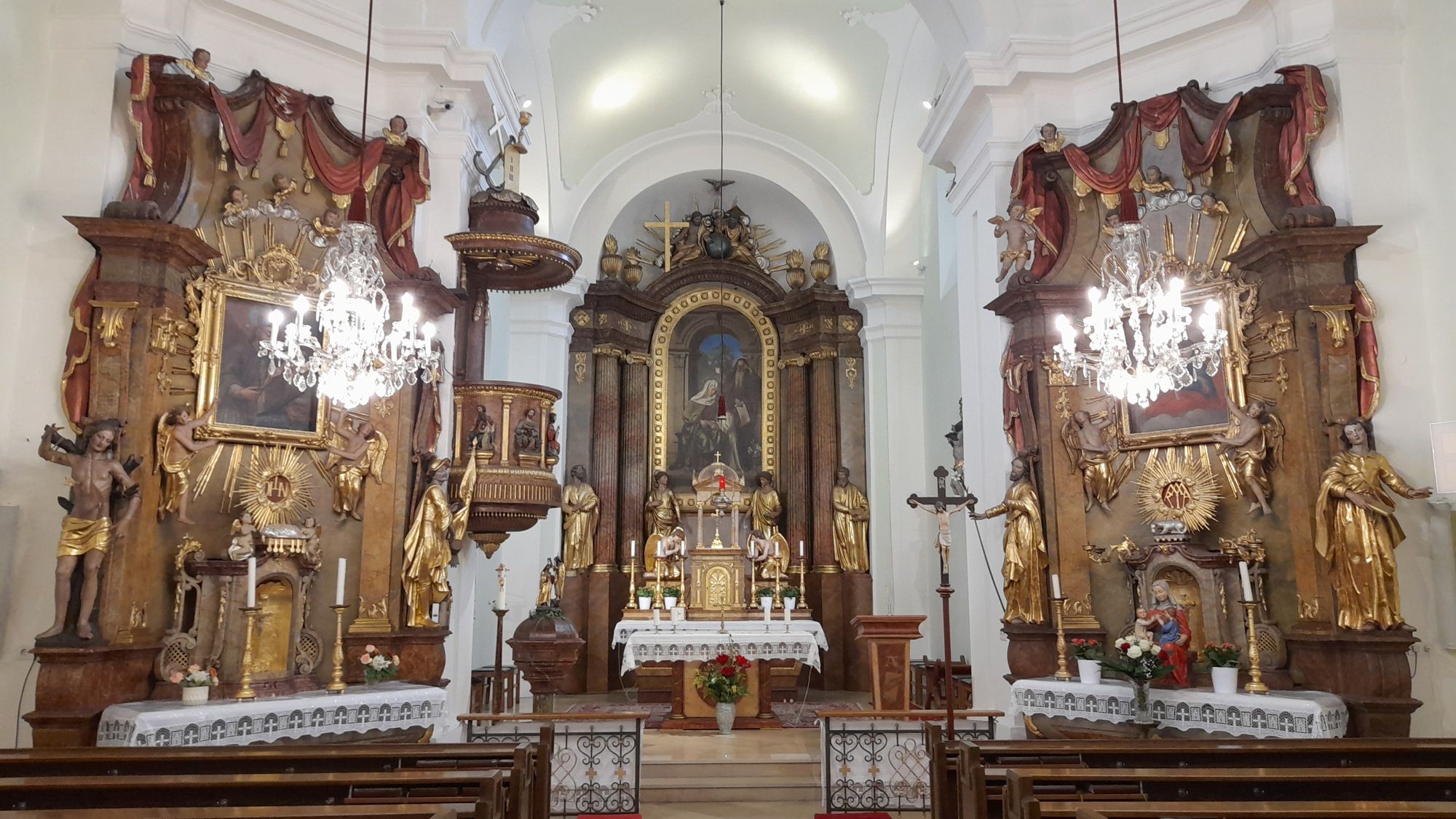 Dva bočné oltáre v neskorobarokovom štýle pochádzajú z 18. storočia. Ľavý bočný oltár so sochami svätého Sebastiána a svätého Floriána je zasvätený svätému Jánovi Nepomuckému (Jánov oltár). (Pravý bočný oltár sa nazýva oltár Panny Márie. ) Vedľa "Mariahilfbild" sa nachádzajú sochy svätého Jozefa a svätého Jána Evanjelistu.