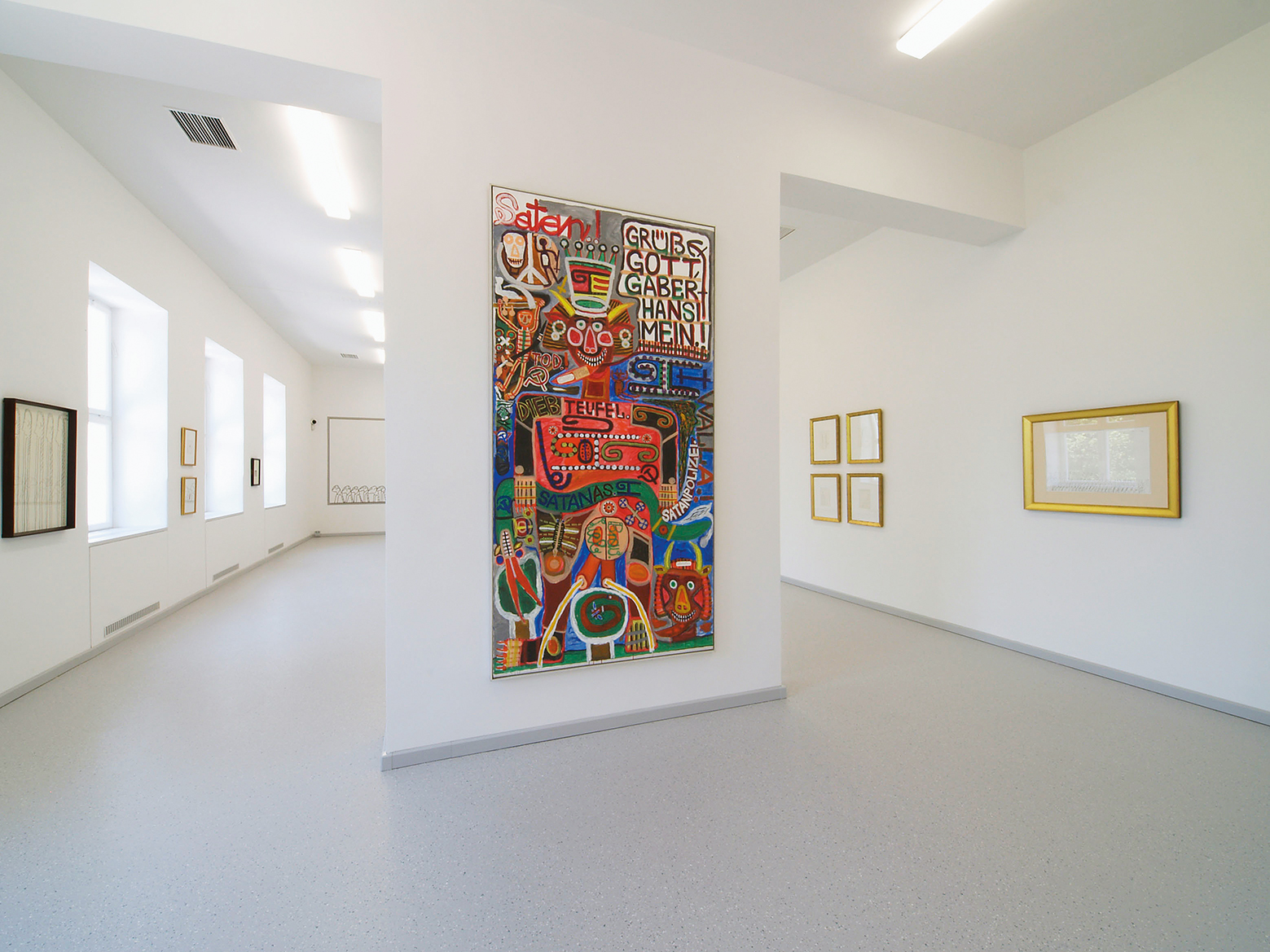 V galérii Gugging sú aktuálne obrazy, kresby, tlačené diela, objekty od umelcov z Guggingu, doplnené medzinárodnými dielami Art Brut, tie si môže návštevník aj zakúpiť.