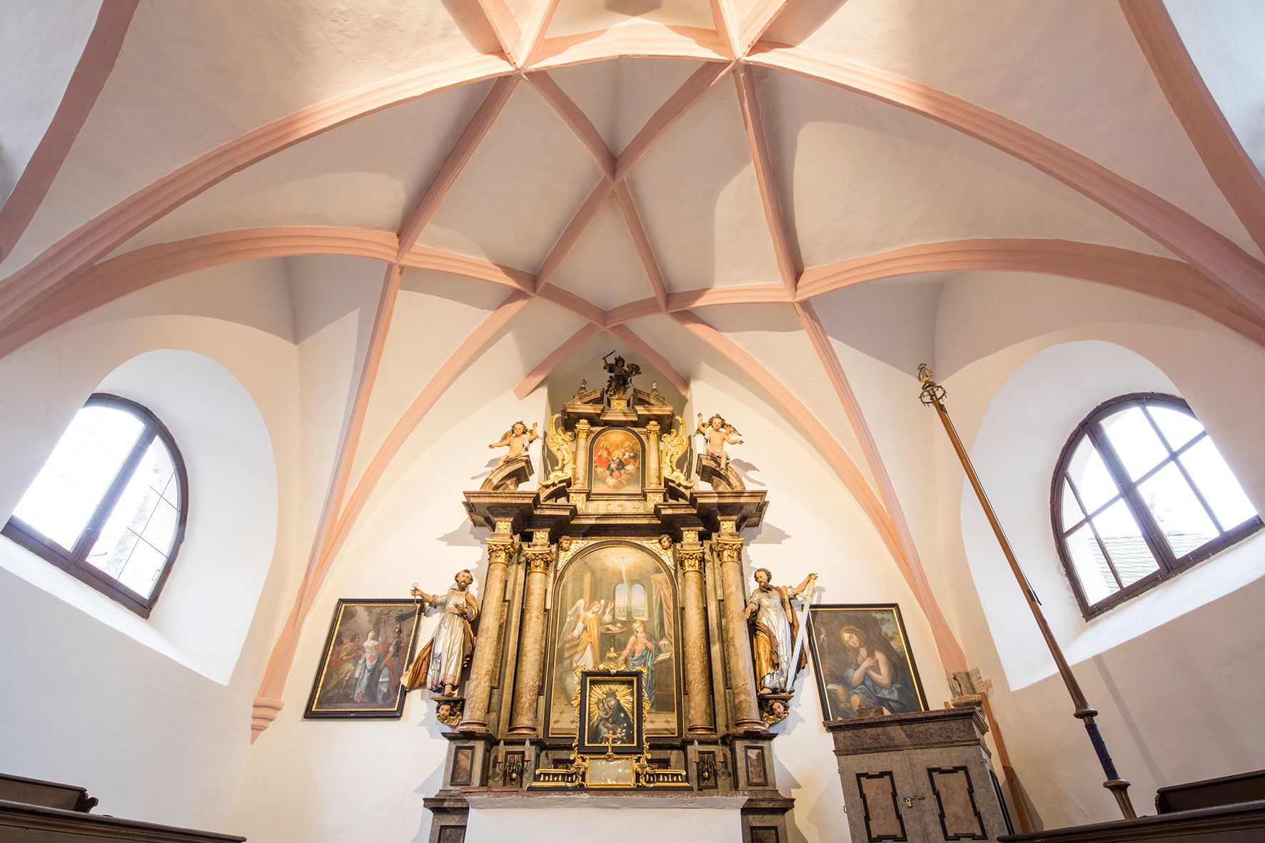 Cez predsieň sa vchádza na galériu s pohľadom na zhruba štvorcovú miestnosť kaplnky. Polygonálna rebrová klenba prezrádza neskorogotický pôvod kaplnky. Na ranobarokovom hlavnom oltári sú sochy z dielne slávneho sochára Mateja Schwanthalera. Oltárny obraz "Zvestovanie Panne Márii" je mladý, pochádza z roku 1896. Na dvoch bočných oltároch je vľavo oltárny obraz svätého Floriána a vpravo svätého Leopolda s raným pohľadom na opátstvo Melk pred jeho barokovou obnovou.