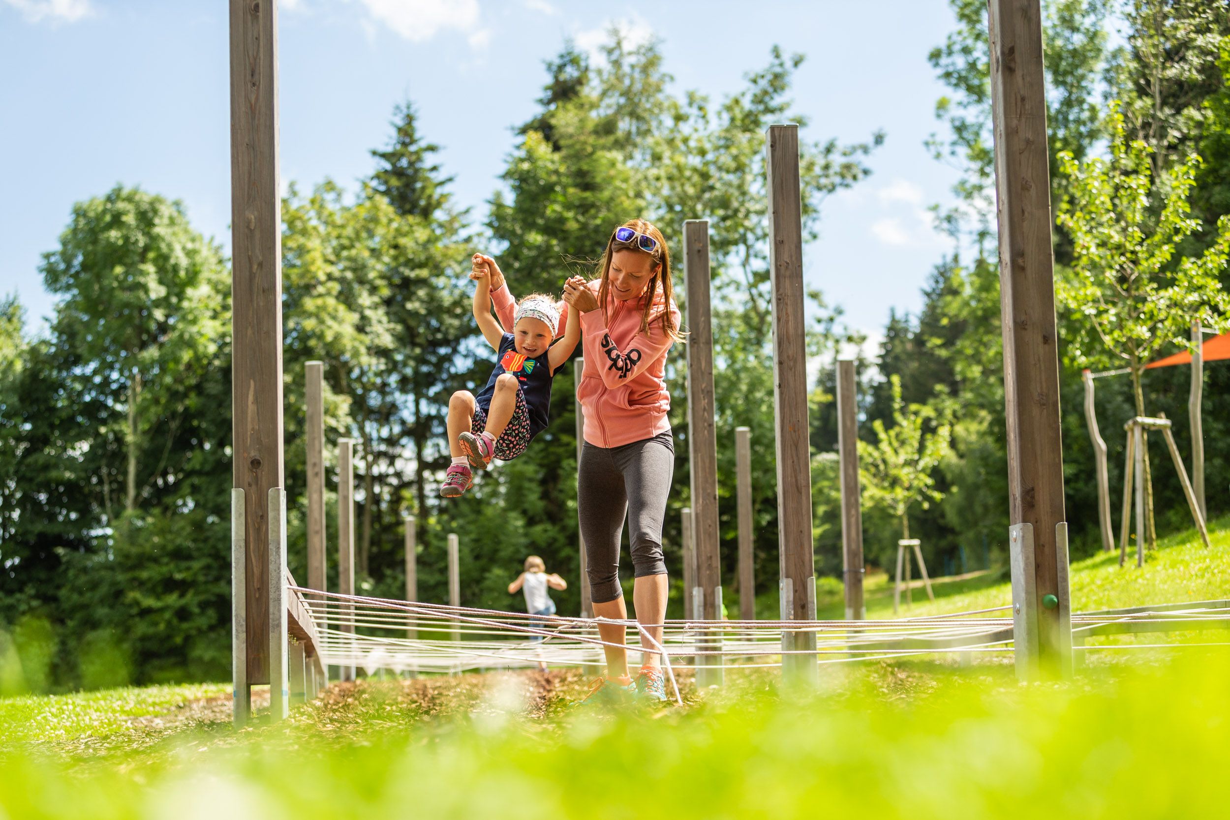 „Pozrite, čo všetko dokážem!“ Park motorických zručností v zážitkovej aréne strediska St. Corona je jedno obrovské ihrisko určené pre deti a všetkých duchom mladých, ktorí sa radi hýbu na čerstvom vzduchu. Na 24 zastávkach s 250 prvkami môžete trénovať rovnováhu a urobiť niečo pre koordináciu a posilnenie svojho tela. Obzvlášť skvelé: Mnoho zastávok možno zvládnuť spoločne.