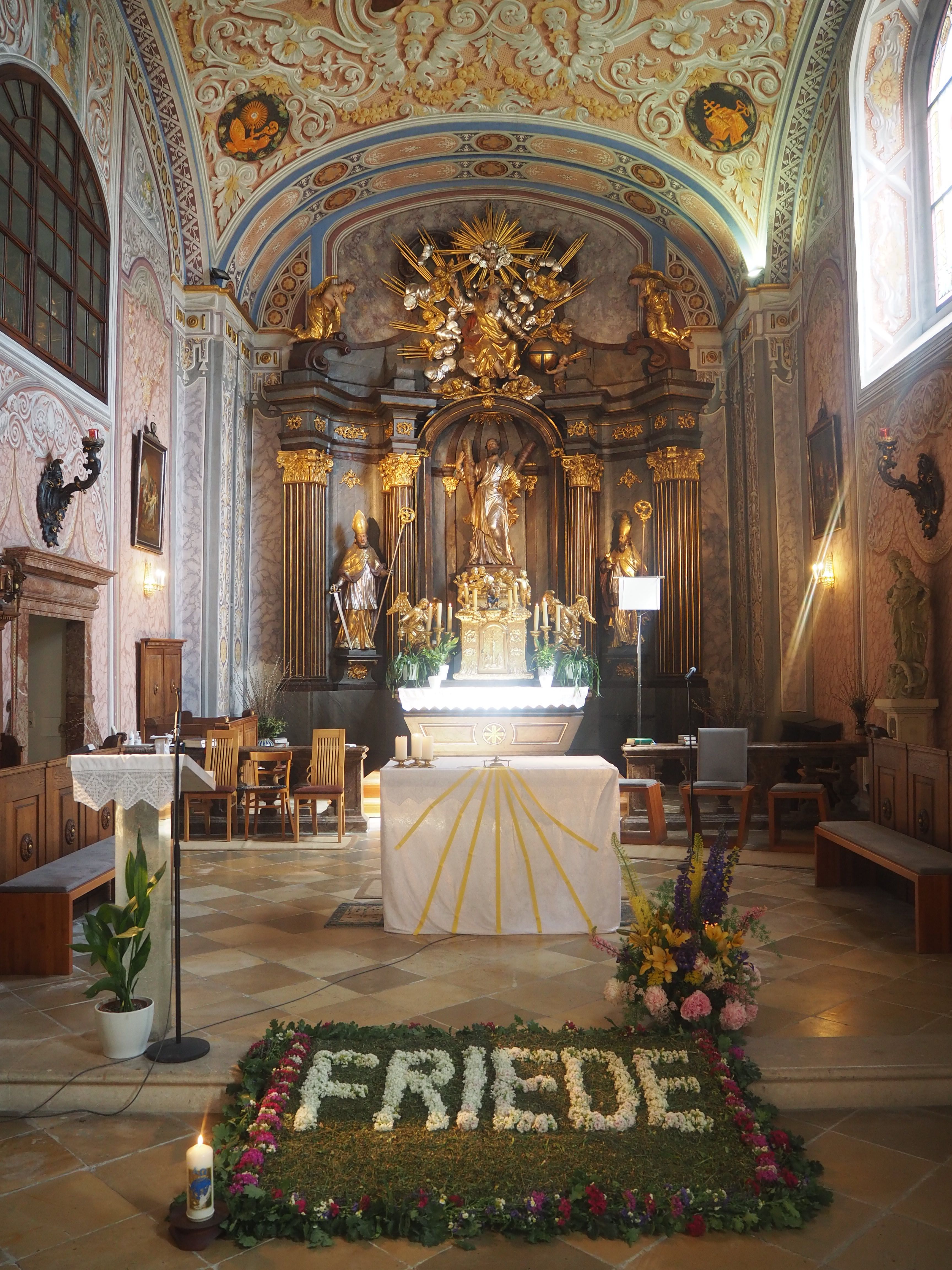 Veža so zvonicou obnovená v roku 1945. Loď s 2 poliami a klenbou medzi dvojitými pásmi. Stropná maľba od Leopolda Mitterhofera (Schmidtovho žiaka z Kremsu).