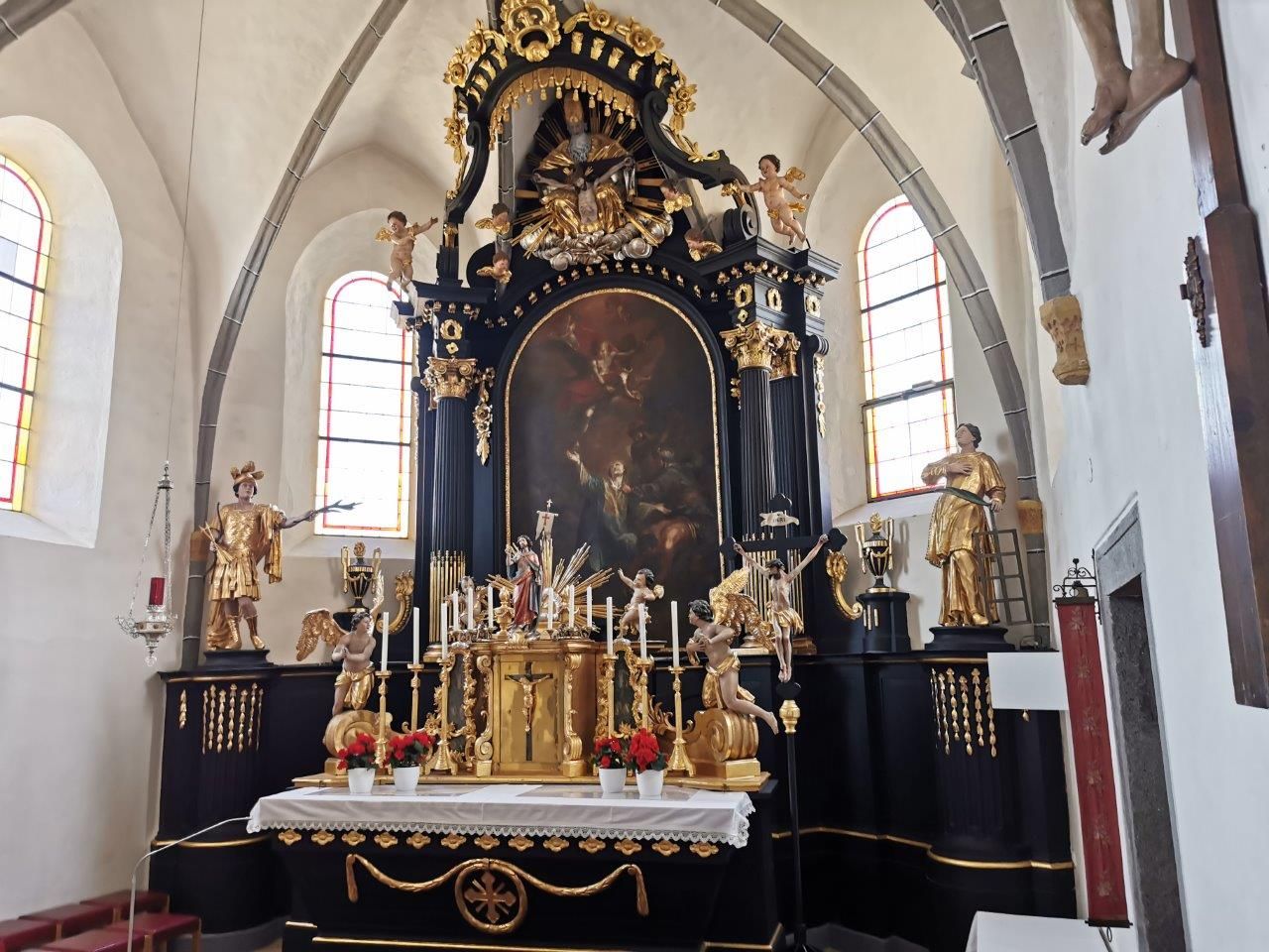 Na oltári Panny Márie vľavo je oltárny obraz "Panna Mária so svätou Katarínou a svätou Barborou", zatiaľ čo na oltári svätých pomocníkov vpravo je oltárny obraz "14 svätých pomocníkov v adorácii Božieho mena". Oba obrazy vytvoril v roku 1681 garstenovský maliar Johann Georg Staindorffer.