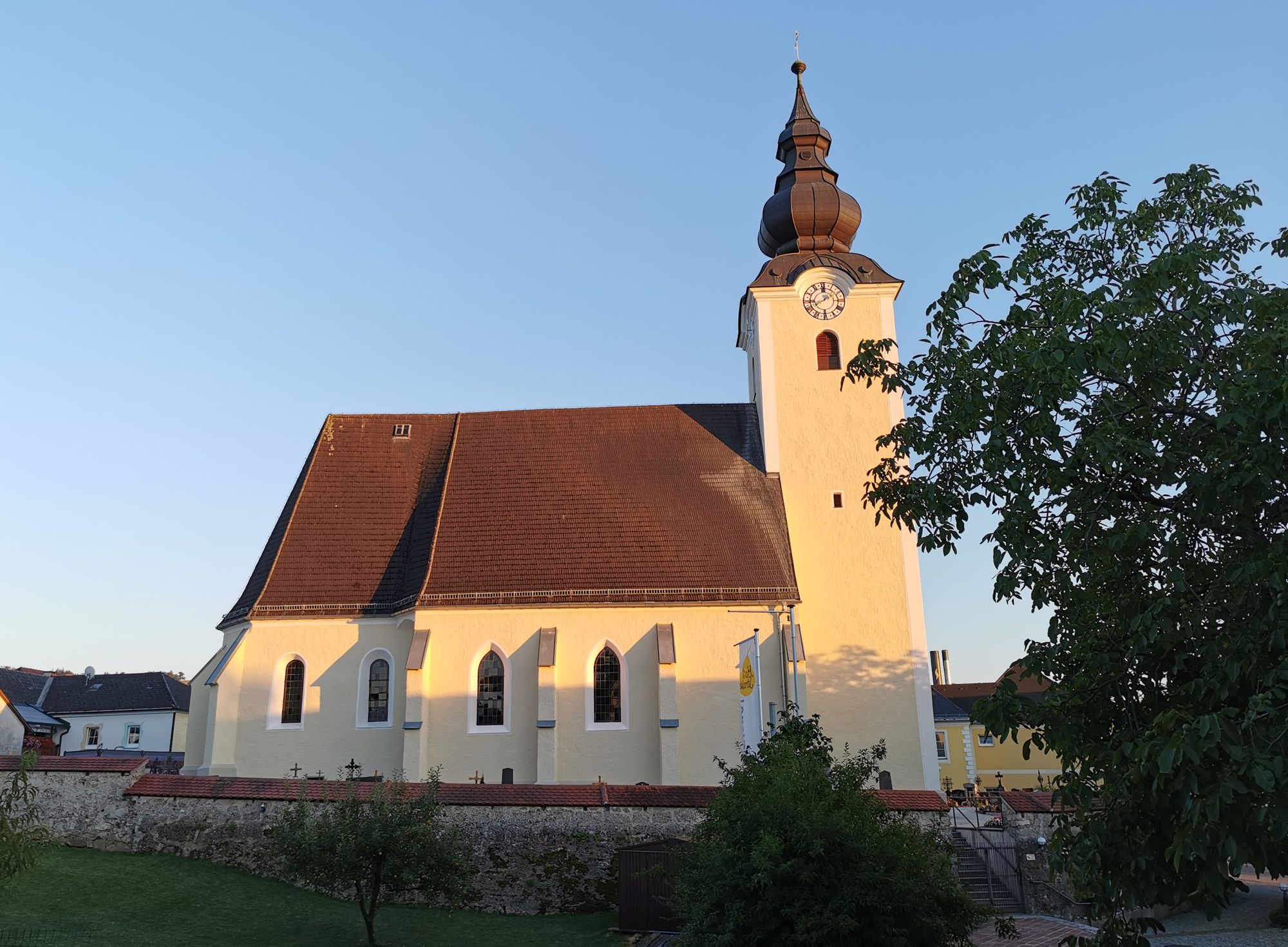 Neskorogotický vidiecky kostol obklopený cintorínom. Stredoveká 40,7 m vysoká veža s hodinovými štítmi nesie barokovú kupolu (1751), ktorú završuje 2 m vysoký pozlátený vežový kríž. K veži prilieha neskorogotická loď (asi 1480) s vysokou strechou a lomenými oblúkovými oknami. Vysoký gotický chór (asi 1400) s barokovými oknami tvorí východný koniec. Vstup na západnej strane vedie do kostola cez jednoduchý lomený oblúkový portál suterénu veže. Na južnej strane vystupuje ako kváder vstupná predsieň s valenou klenbou a prístavba sakristie. Zamurovaný mlynský kameň sa spája s legendou o založení kostola.