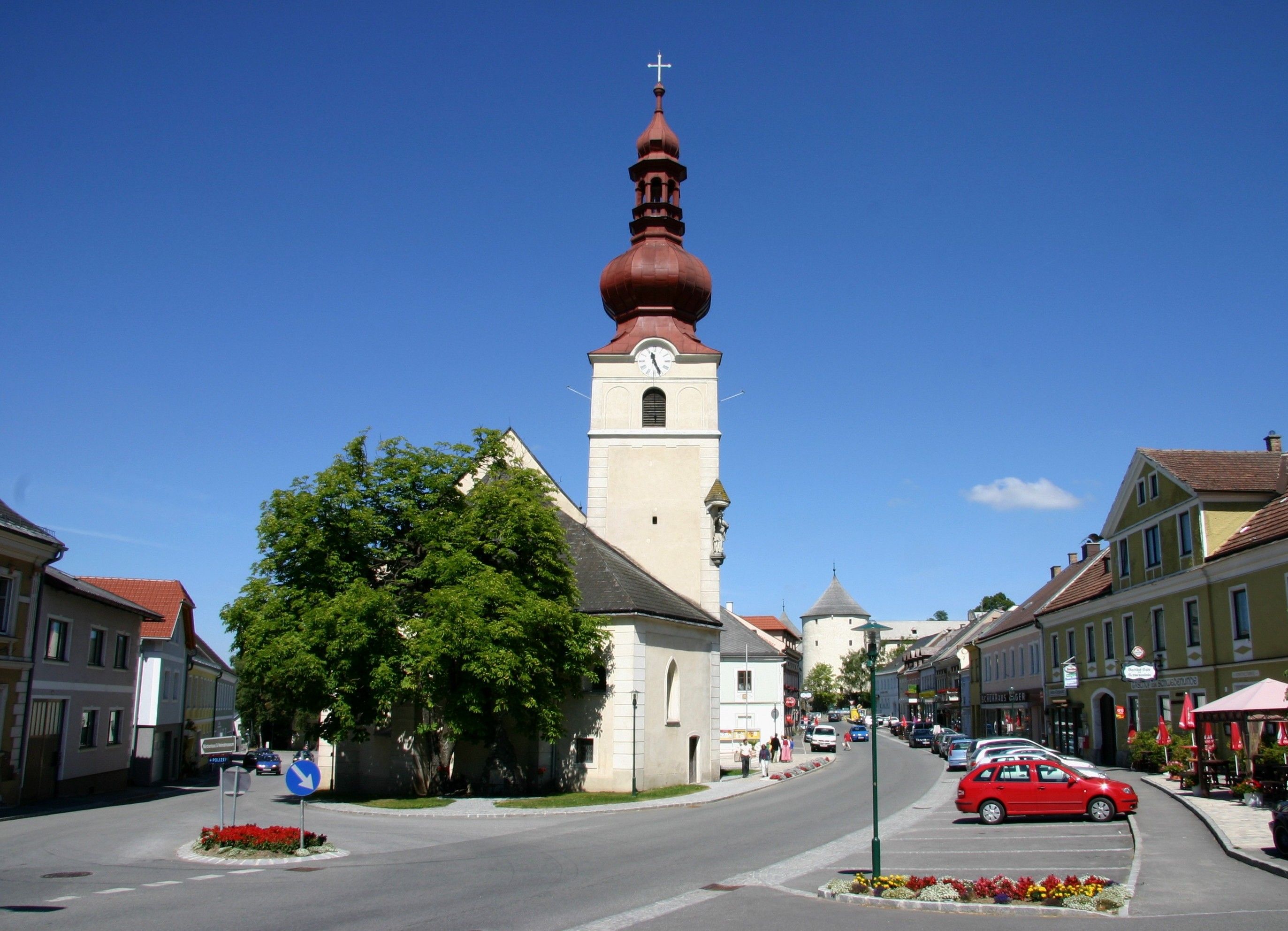 Farský kostol zasvätený svätému Hippolitovi, ktorý sa prvýkrát spomína v roku 1544 spolu s menovaním farára, sa nachádzal mimo trhového námestia na takzvanom Pöltenbergu. Pre chátranie boli bohoslužby v tomto kostole v roku 1744 ukončené. Presbytérium bolo po zriadení cintorína na mieste starého kostola v roku 1870 využívané ako cintorínska kaplnka.