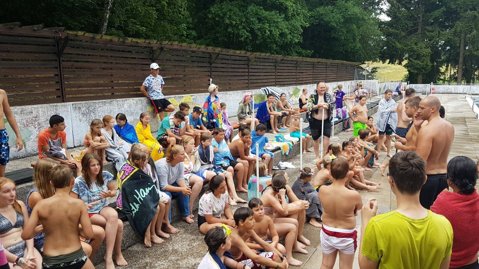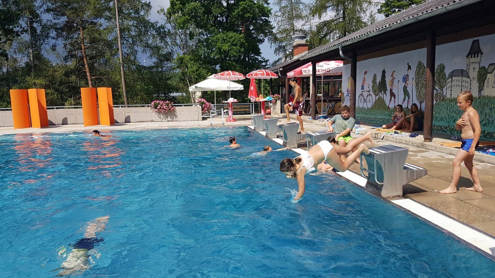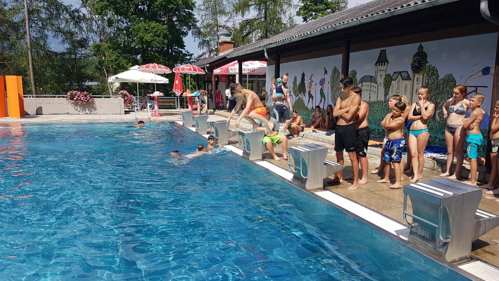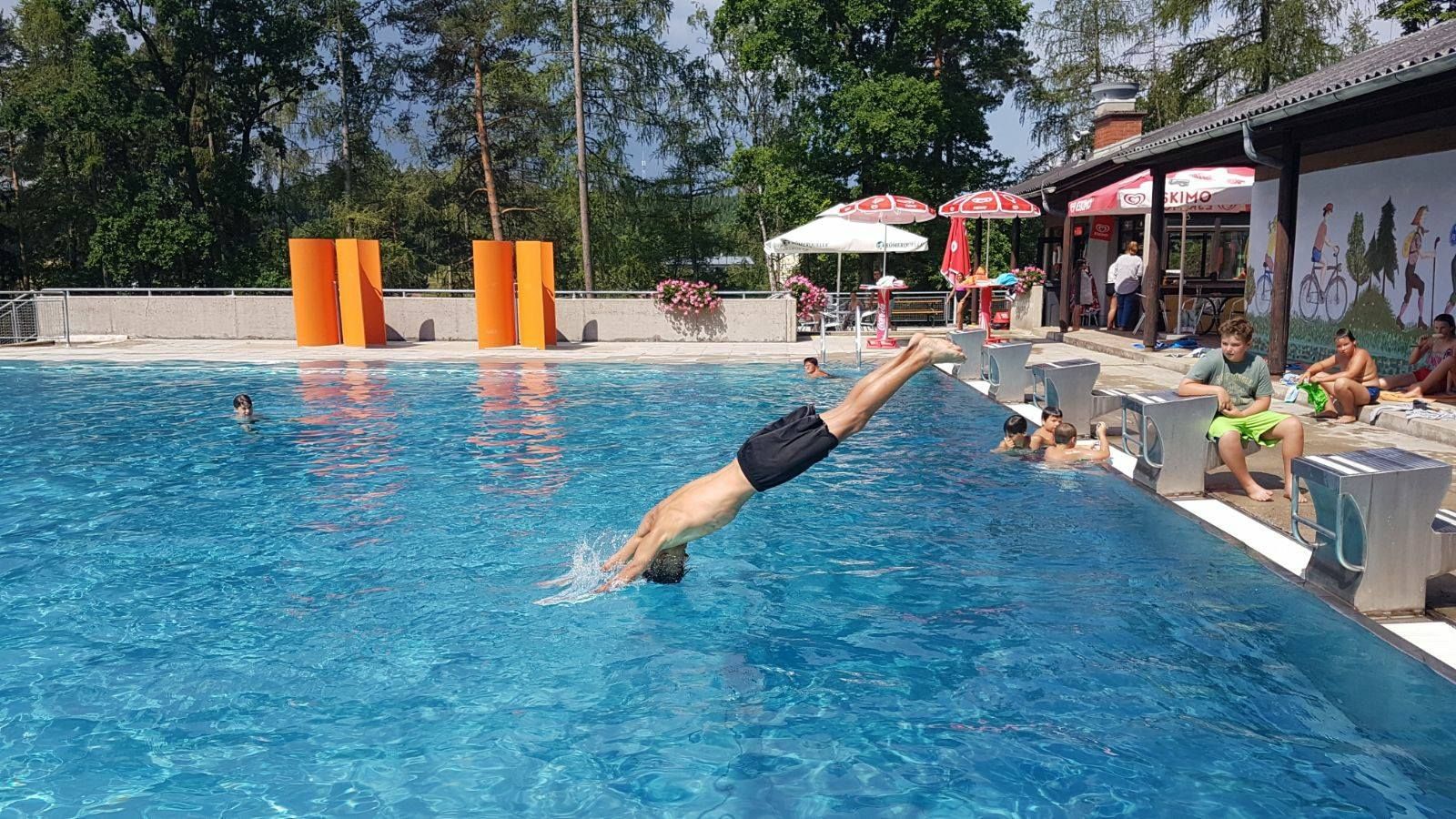 Vyhrievaný športový bazén, detský bazén, veľký priestor na opaľovanie, bufet, detské ihrisko, šatne, WC, tobogán, vodné ihrisko